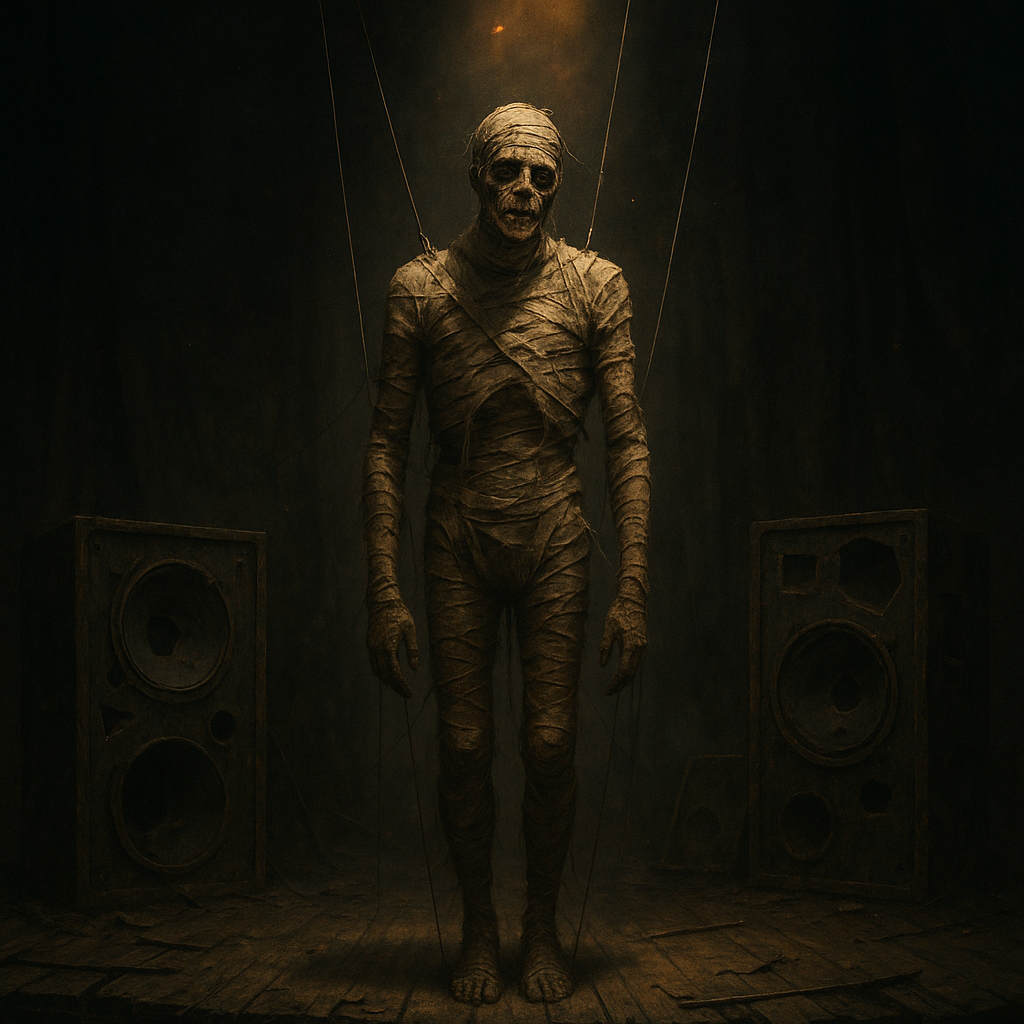 A decaying performer wrapped in bandages, suspended by wires on a forgotten stage, spotlight flickering, surrounded by broken speakers