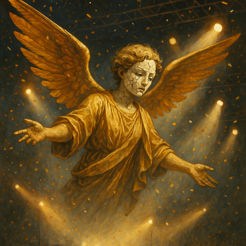 A golden-winged angel-like figure with a cracked porcelain face, hovering above a massive stage, showered in artificial light and confetti, fallen idol symbolism