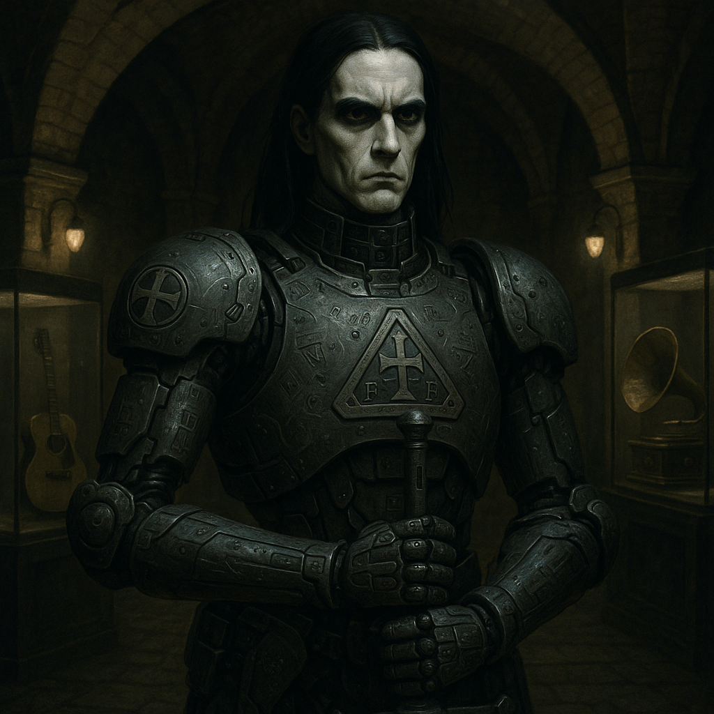 A gothic security figure guarding an underground museum of music relics, robotic armor with ancient symbology engraved