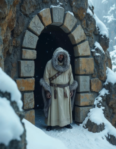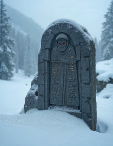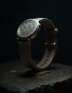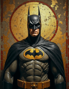 The gothic security figure guarding the underground museum of music relics is looking intense and imposing, with detailed robotic armor engraved with ancient symbology. The dark, moody lighting and the museum setting with relics like a guitar and gramophone add a rich narrative layer.