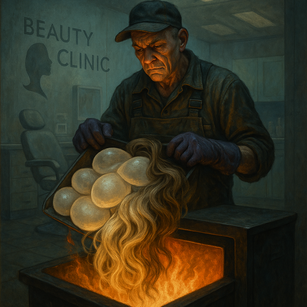 A janitor in a beauty clinic dumping piles of silicone implants and fake hair into a glowing trash incinerator, dystopian beauty decay