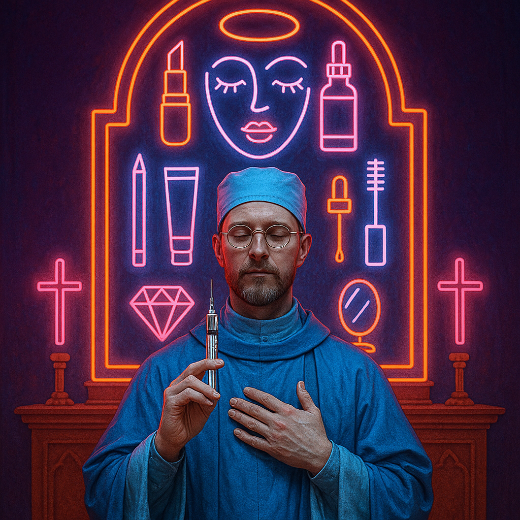 The image of the priest-like man in surgical robes holding a syringe like a holy relic, standing in front of a neon-lit altar of beauty icons with a religious-cosmetic cult aesthetic is ready.
