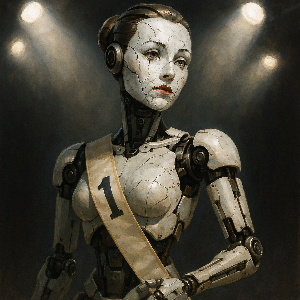 A robotic beauty pageant contestant with a cracked porcelain face, numbered sash, and mechanical limbs, standing under harsh stage lights