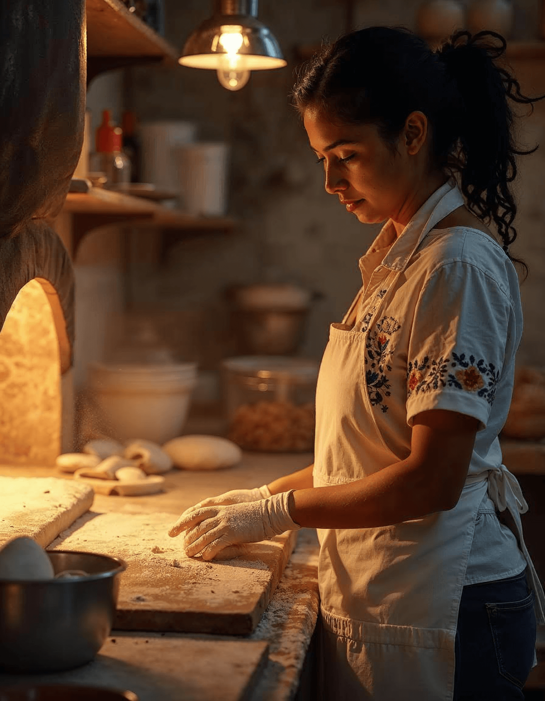 A skilled baker works dough in a golden-lit bakery, flour dusting their hands and apron. Experience the warmth and artistry of traditional baking.