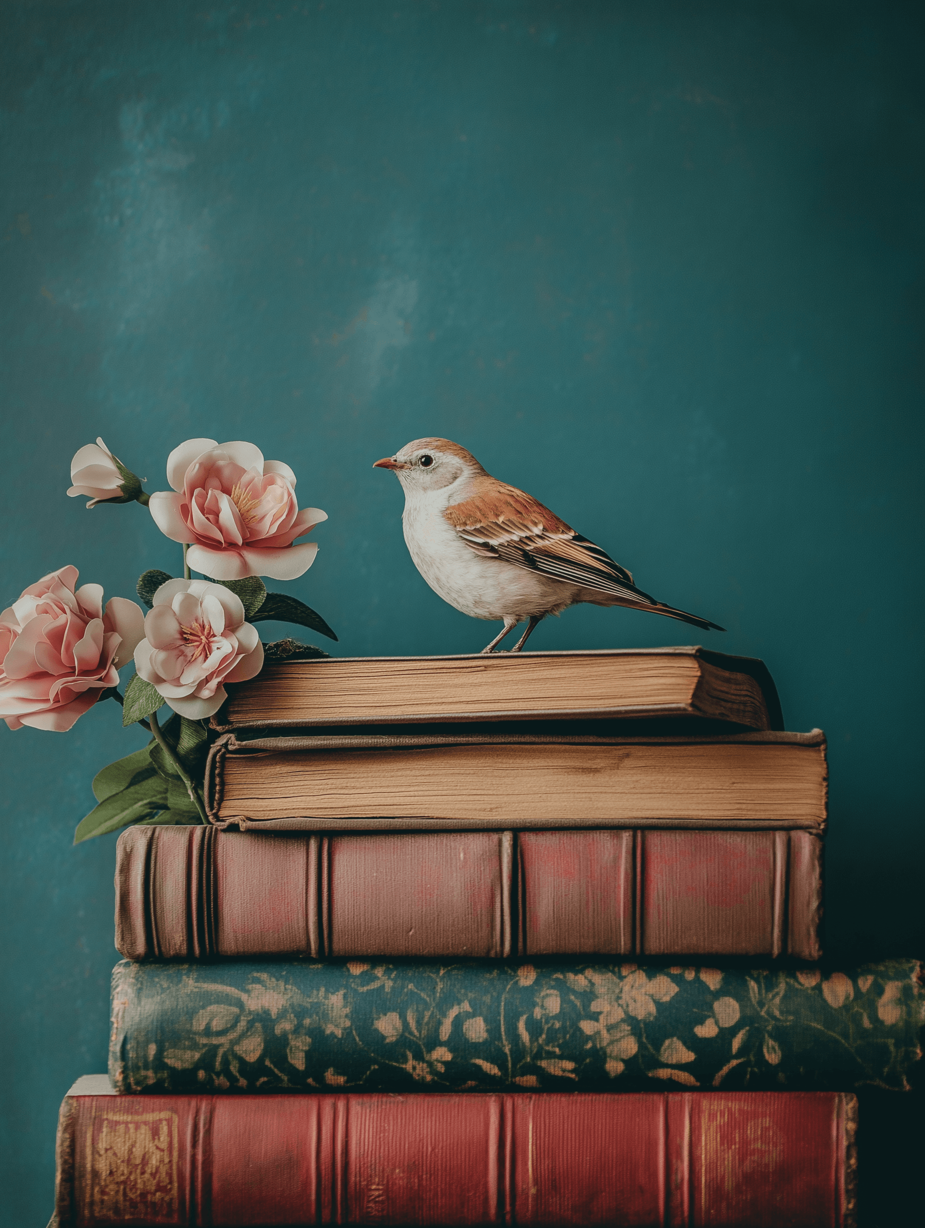 A bird perched on a stack of books, symbolizing the knowledge and joy pets bring to their owners’ lives