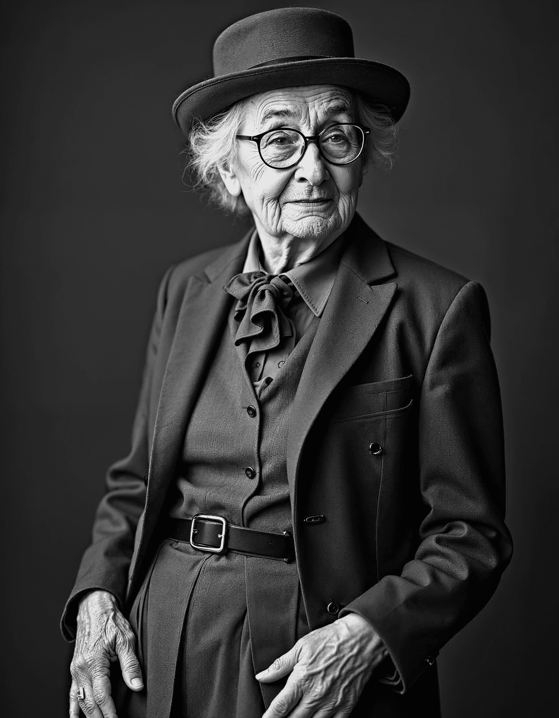 A black and white portrait of an elderly person wearing a vintage outfit, reflecting on their personal fashion journey
