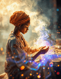 A blacksmith forging weapons from the essence of spirits, with glowing tools that hum with otherworldly energy