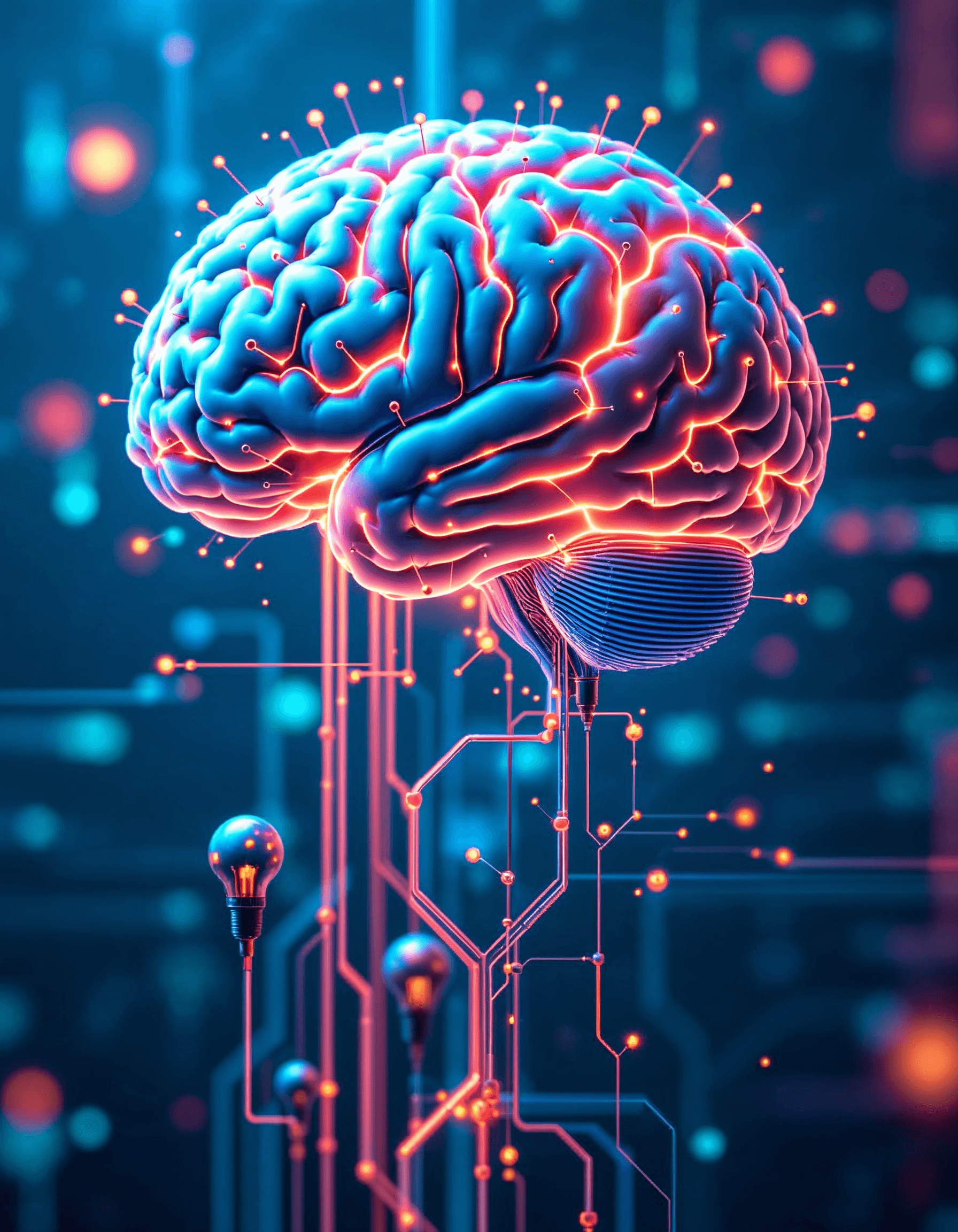 A brain connected to a computer network, representing the increasing integration of technology and human thought