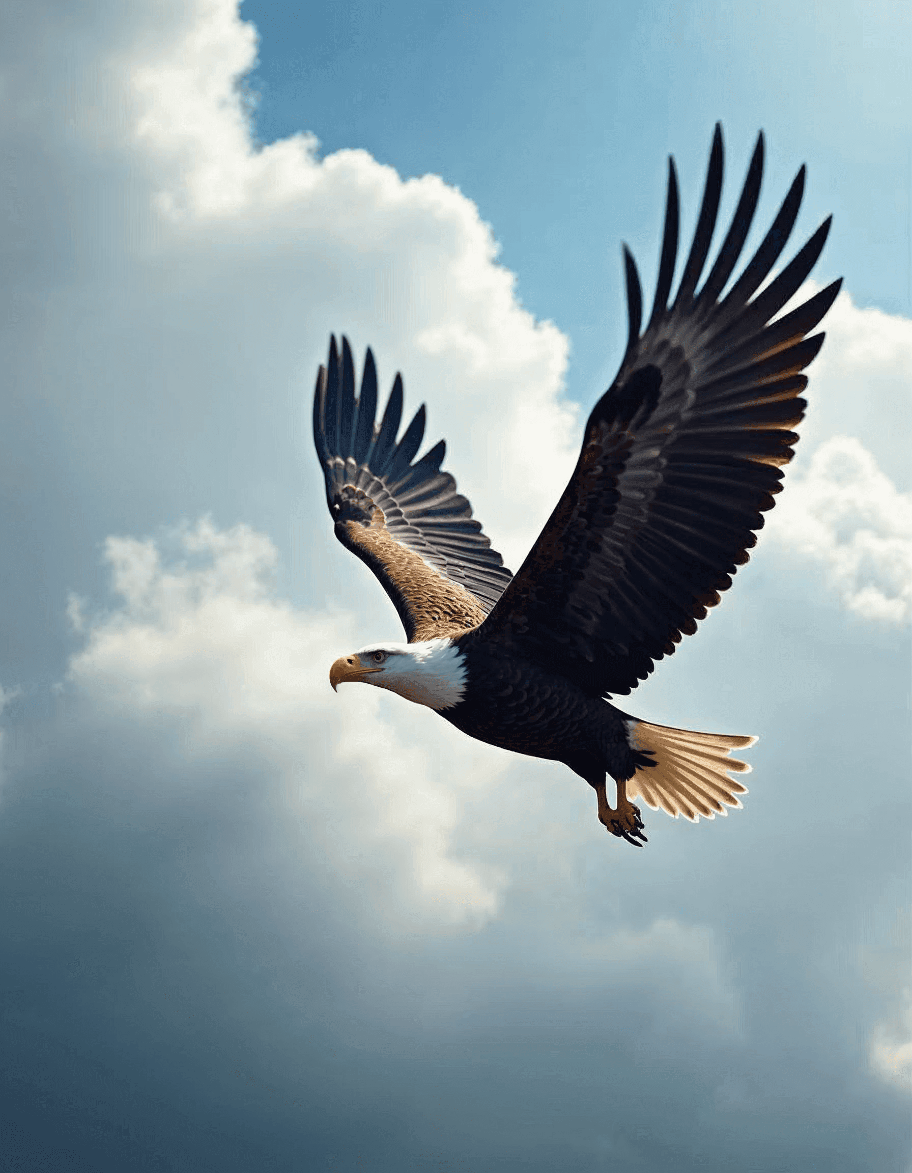 Witness the breathtaking power and grace of America’s national bird as this stunning bald eagle glides effortlessly through dramatic cloud formations.