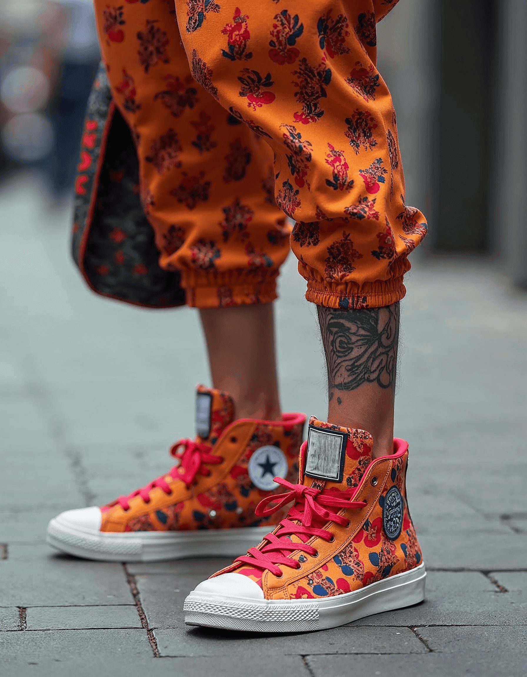 A close-up of unique street style details, like bold patterns, statement sneakers, and DIY accessories