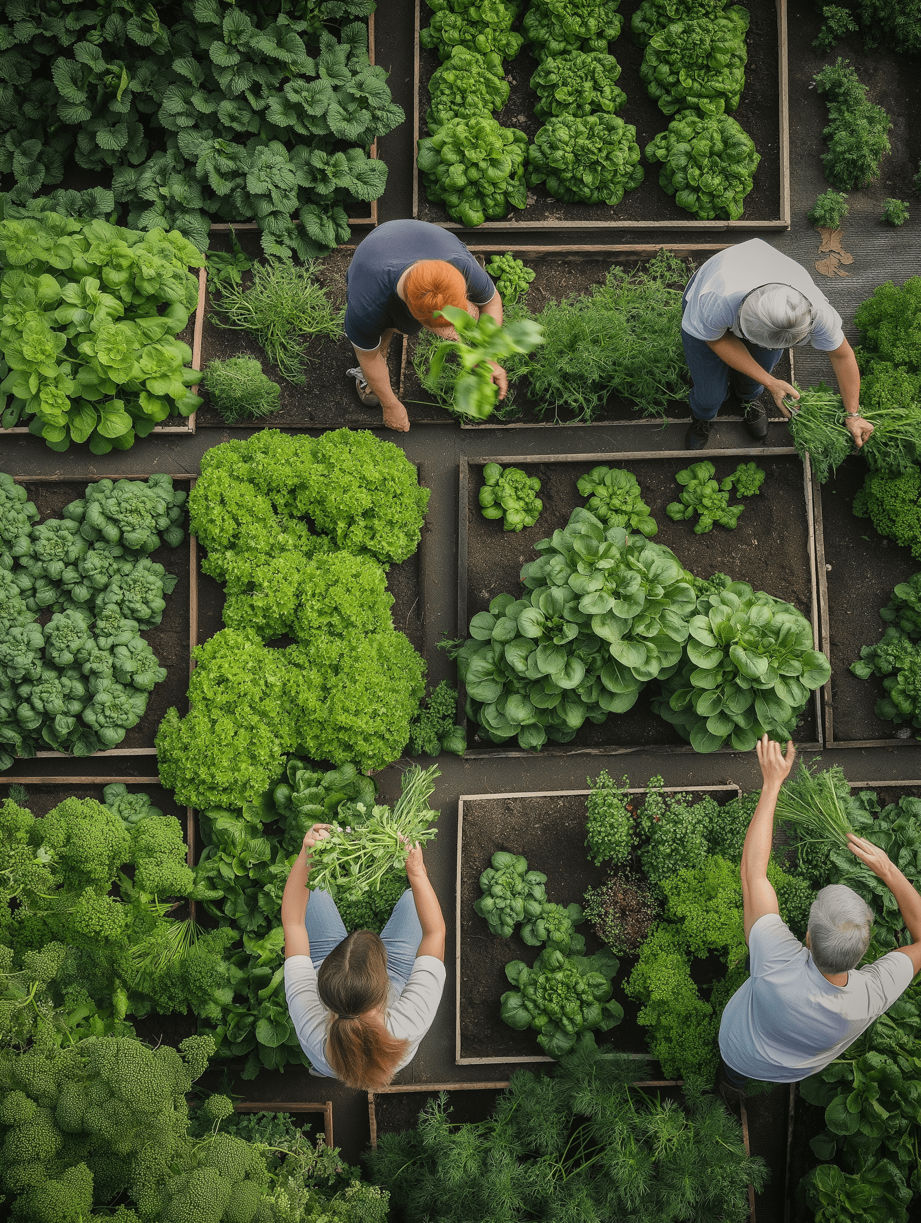 A community garden with people tending to plants, symbolizing local efforts to promote sustainability and resilience to climate change