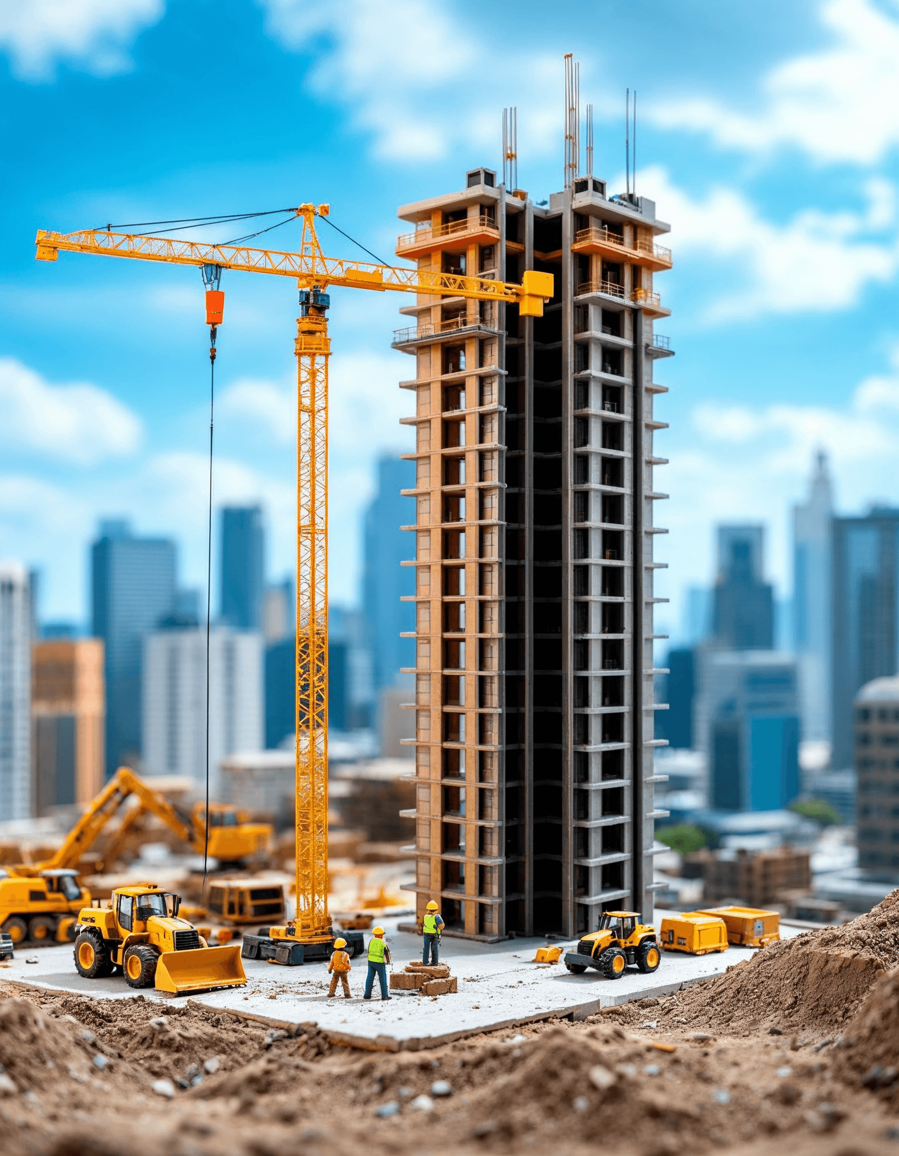 A construction site with miniature cranes, bulldozers, and workers building a skyscraper