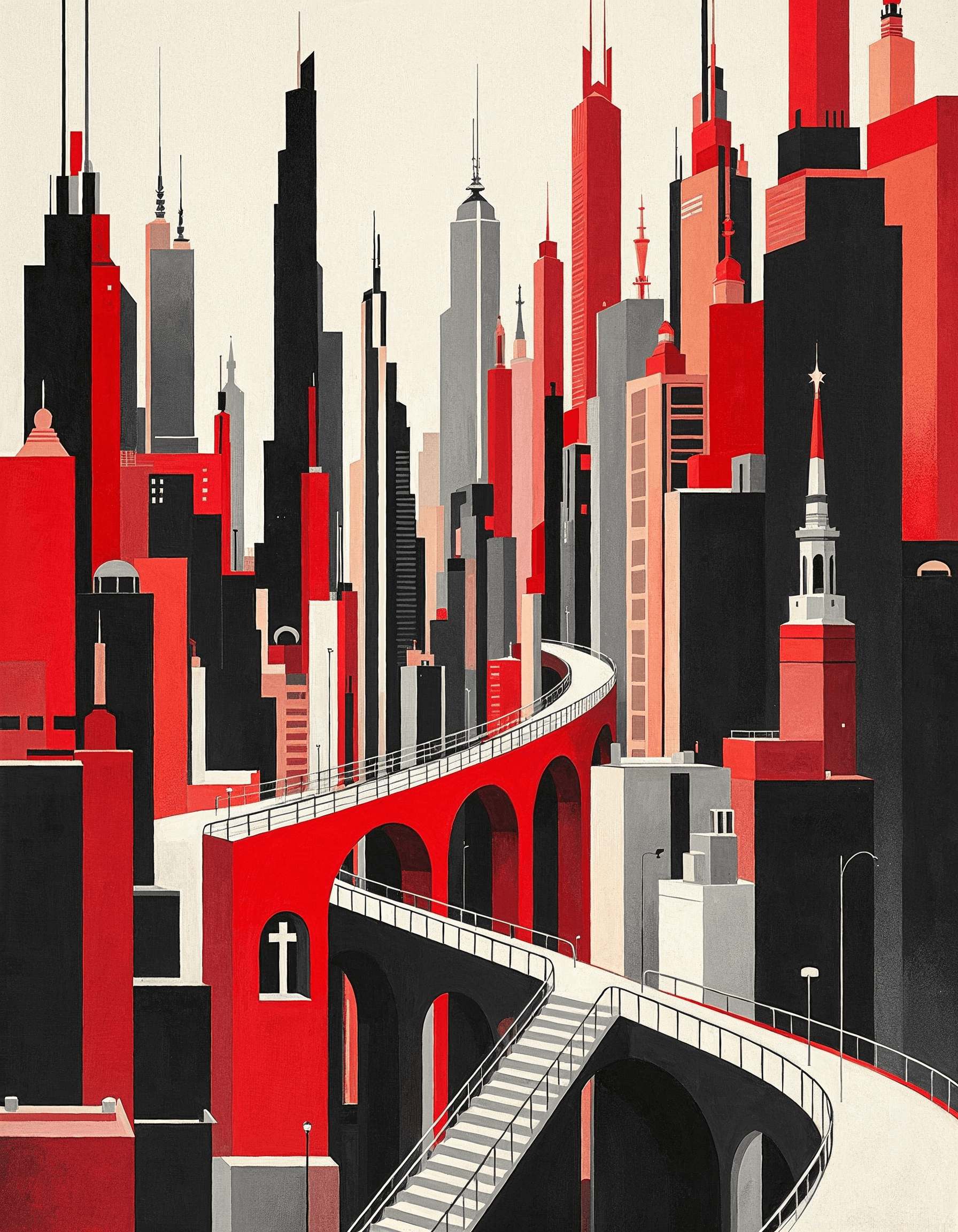 A constructivist cityscape of geometric skyscrapers and bridges, layered in bold reds, blacks, and whites, with strong diagonal lines suggesting upward momentum