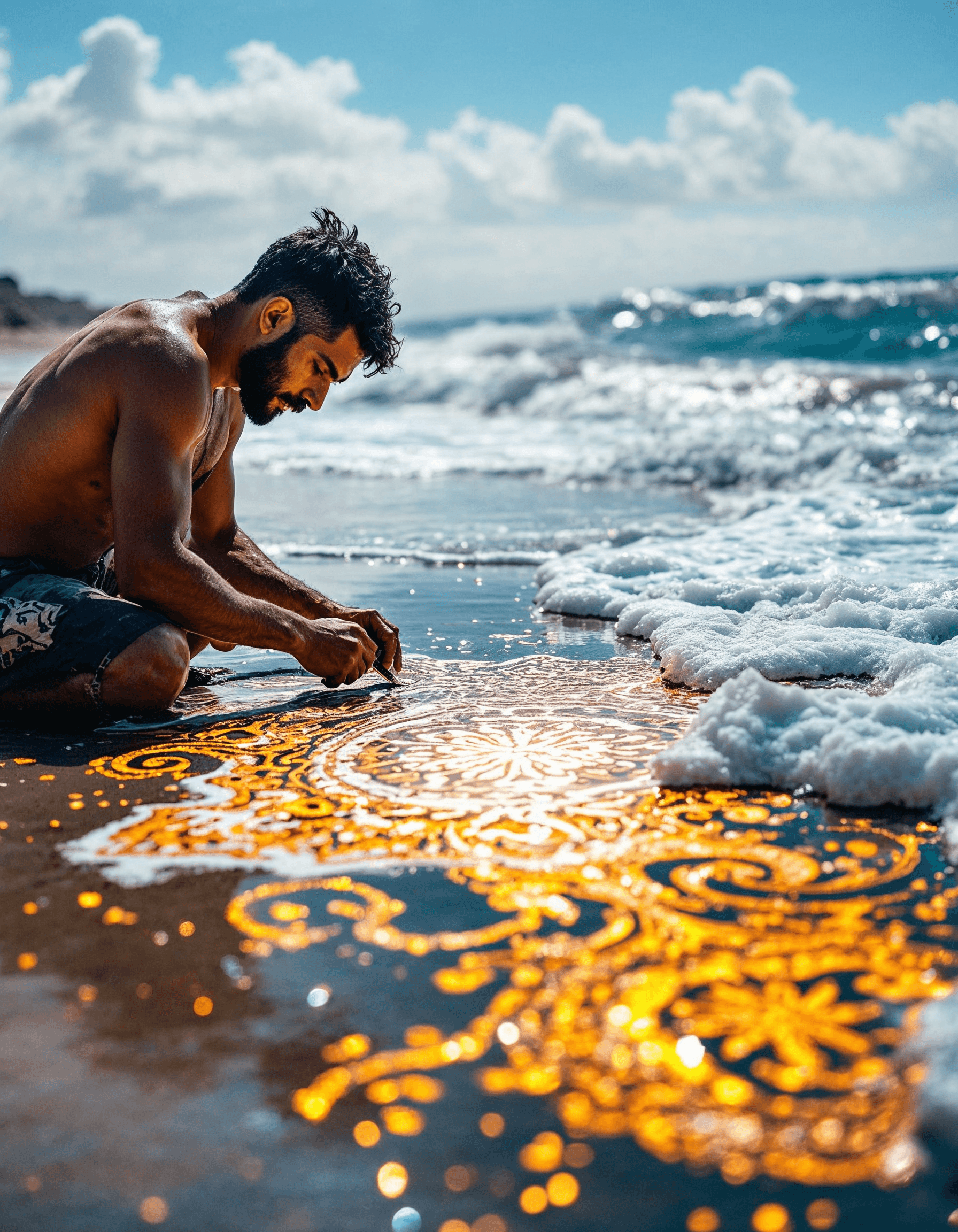 A craftsman creating intricate patterns on a beach, with tools and stencils in hand while waves gently approach