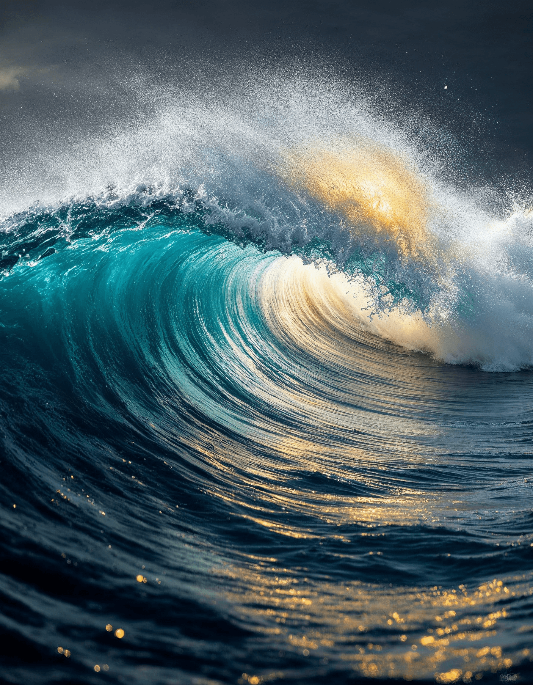 A crashing ocean wave turning into flowing ribbons of golden light, symbolizing nature’s constant cycle of renewal