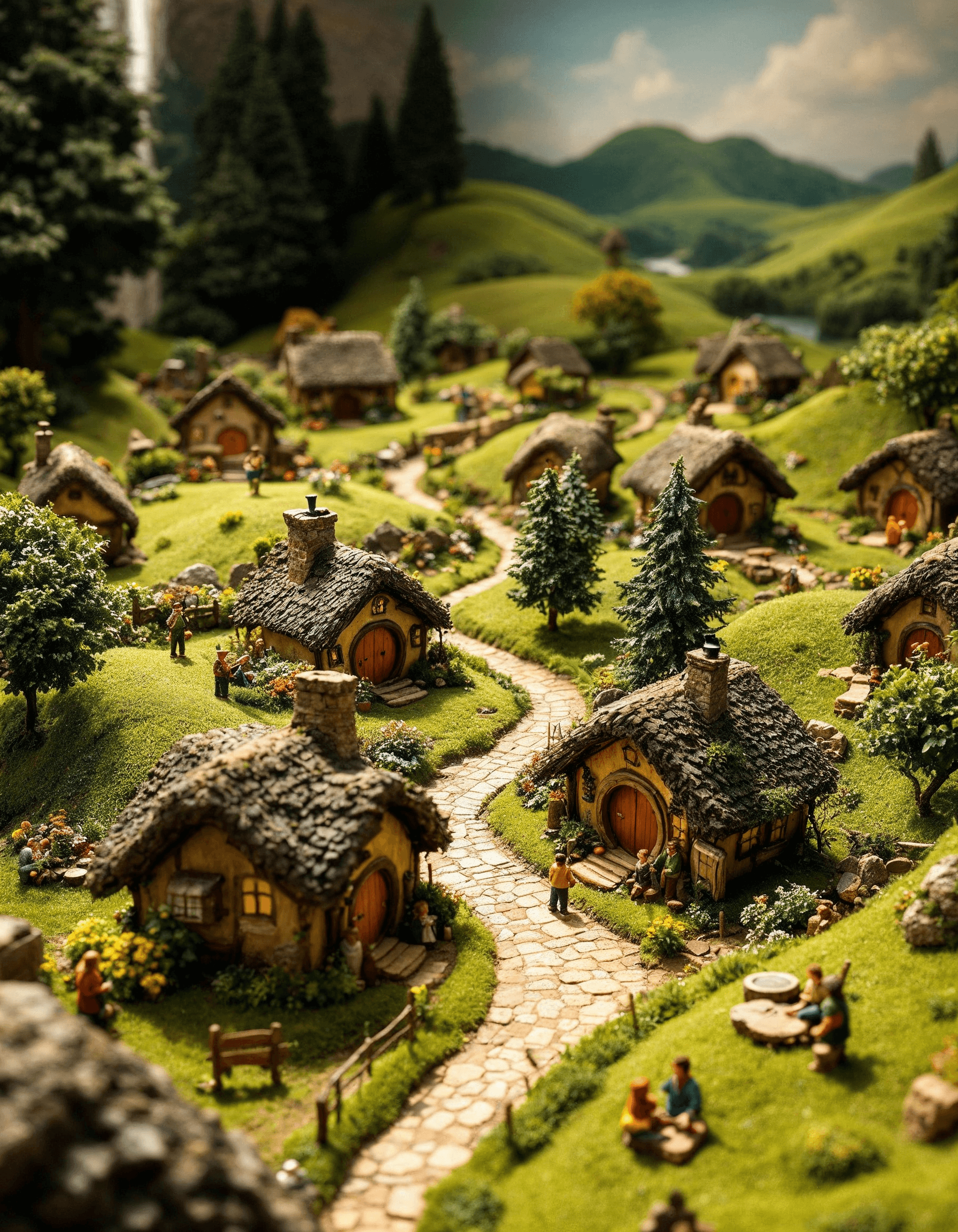 Step into Middle-earth with this enchanting Hobbiton diorama featuring tiny hobbits, charming hobbit-holes, and the peaceful rolling landscape of the Shire.