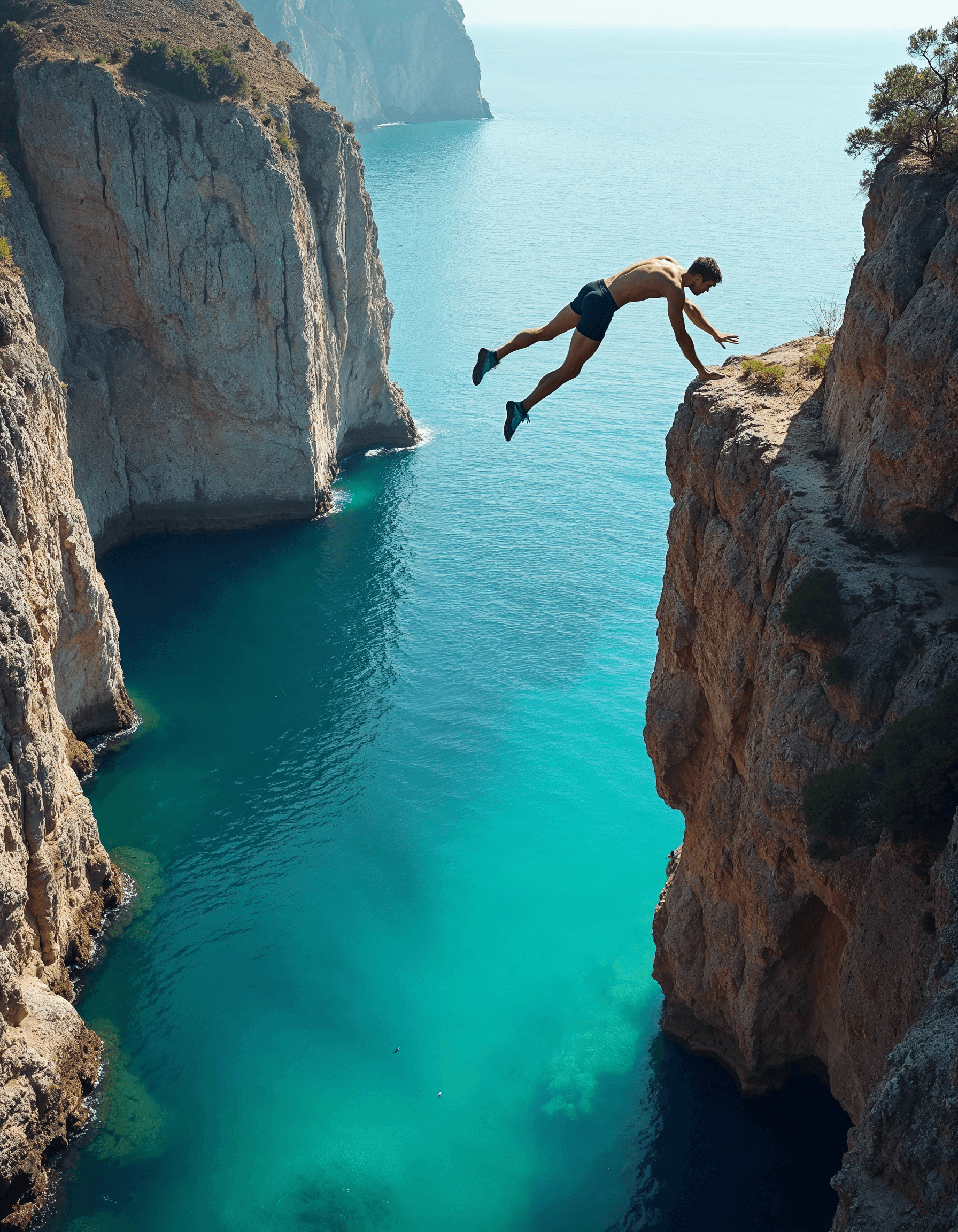 A diver leaping from a high cliff into a turquoise pool below, emphasizing the height and the beauty of the surroundings