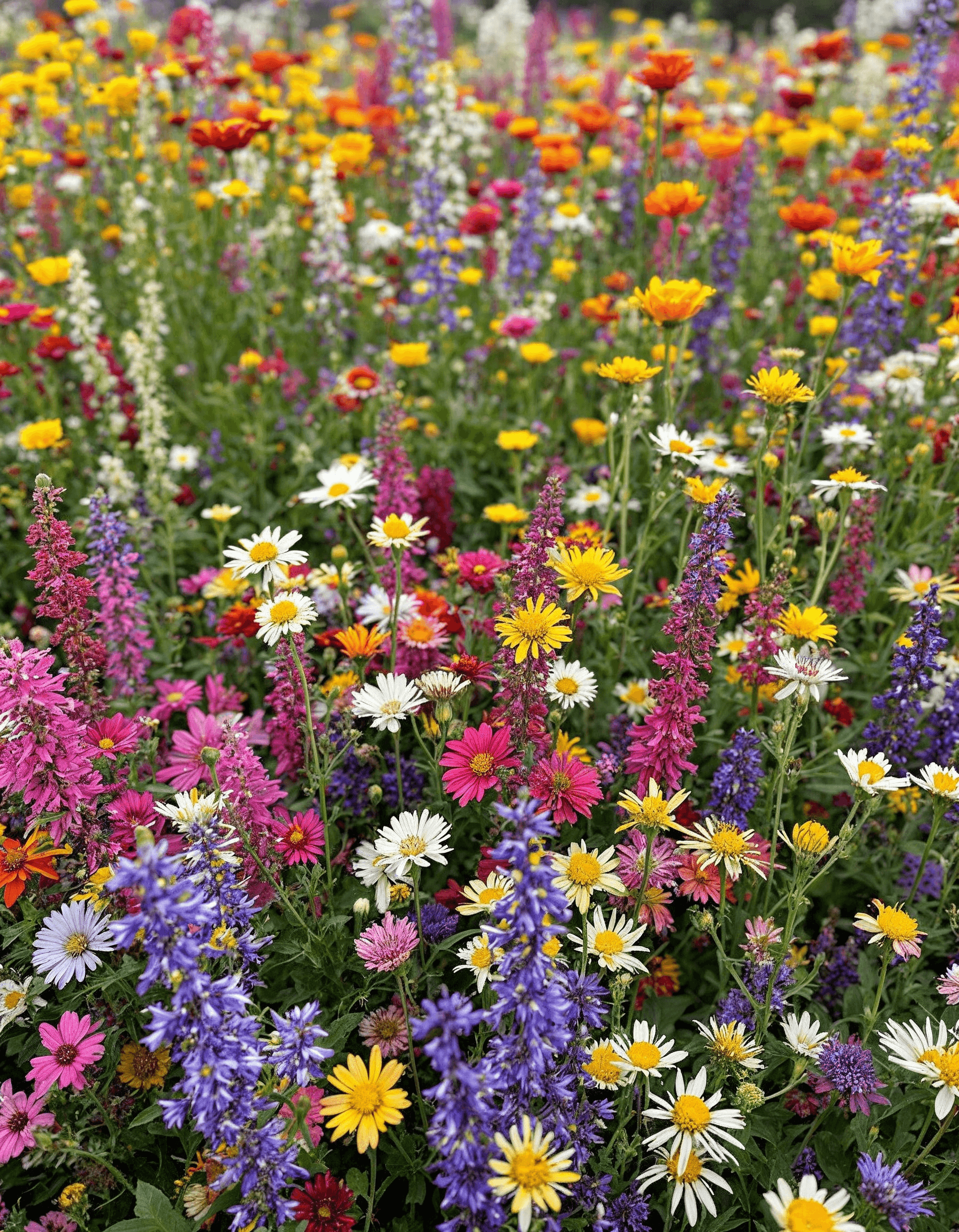 A field of wildflowers, showcasing the diverse patterns and colors of different species blooming together