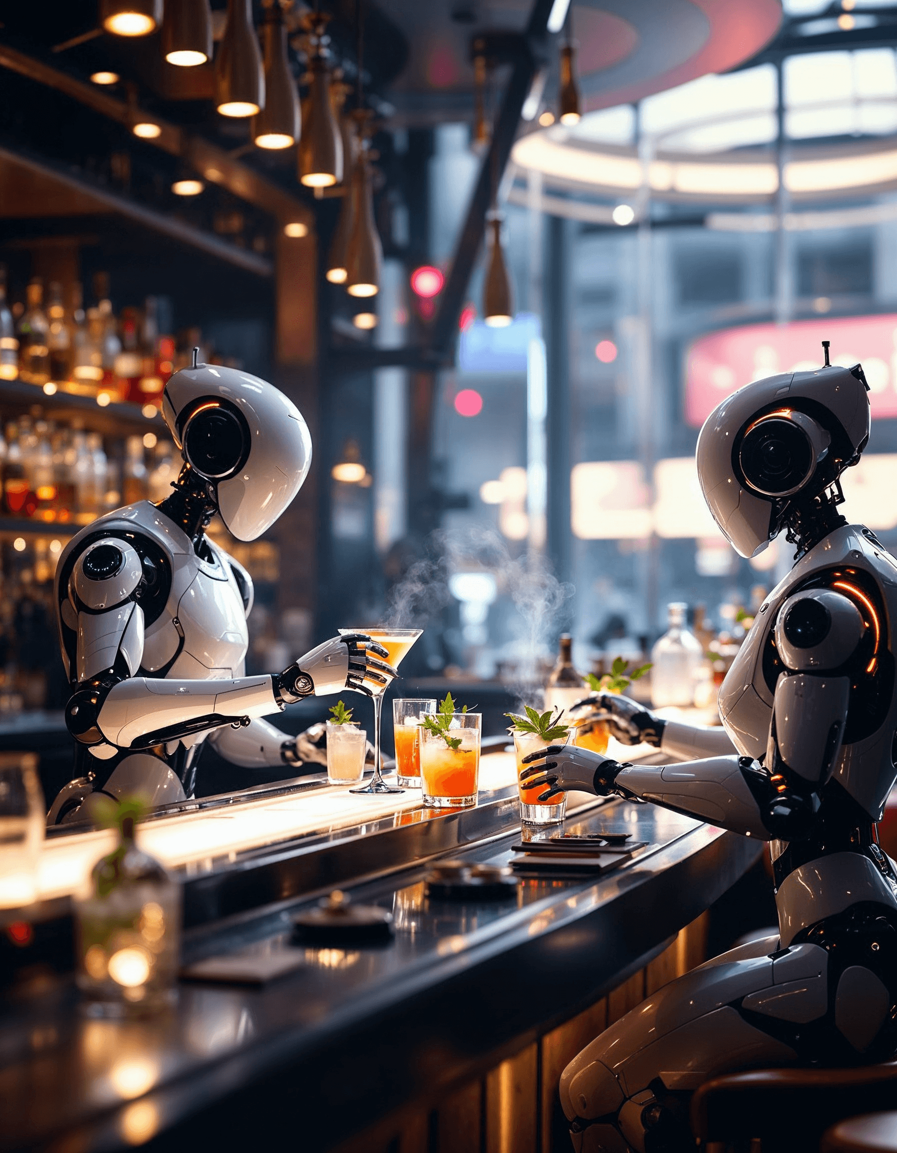 A futuristic bar scene with robotic bartenders creating innovative and personalized cocktails