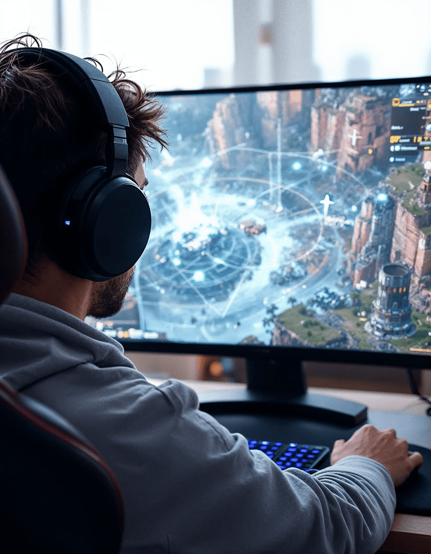 A gamer wearing headphones, immersed in a virtual world with realistic sound effects and spatial audio