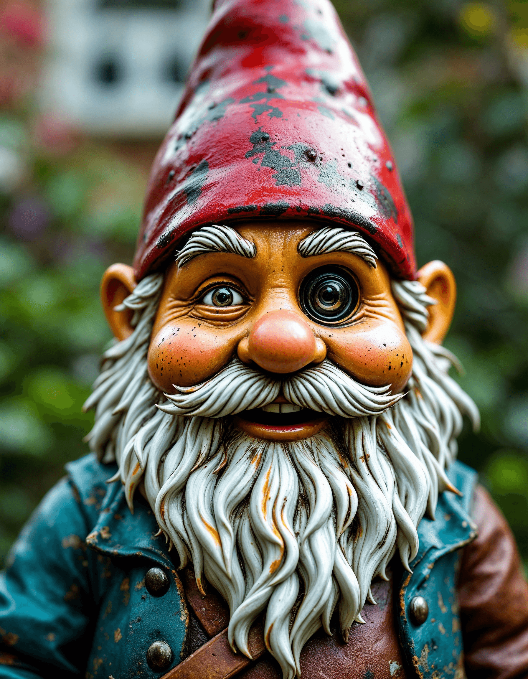 A garden gnome with a surveillance camera hidden inside, its cheerful exterior concealing a watchful eye