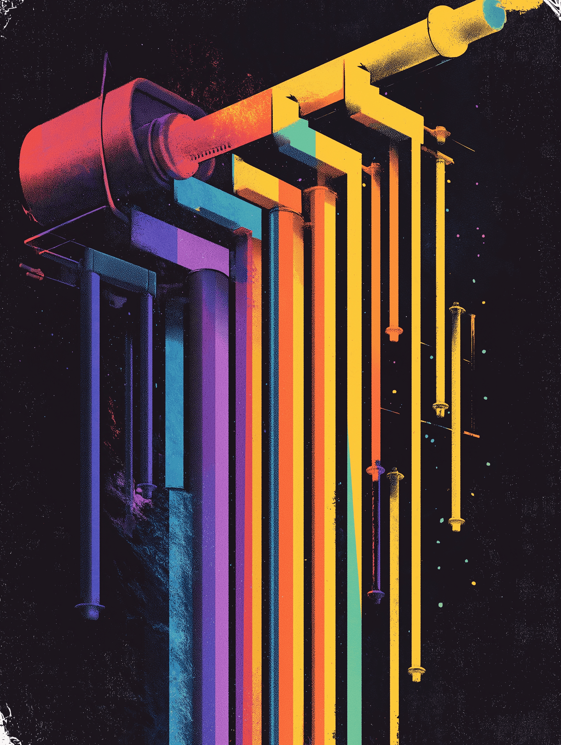 A massive pipette adds vibrant colored liquids to a building’s skeletal frame, creating a surreal blend of scientific precision and architectural construction in progress.
