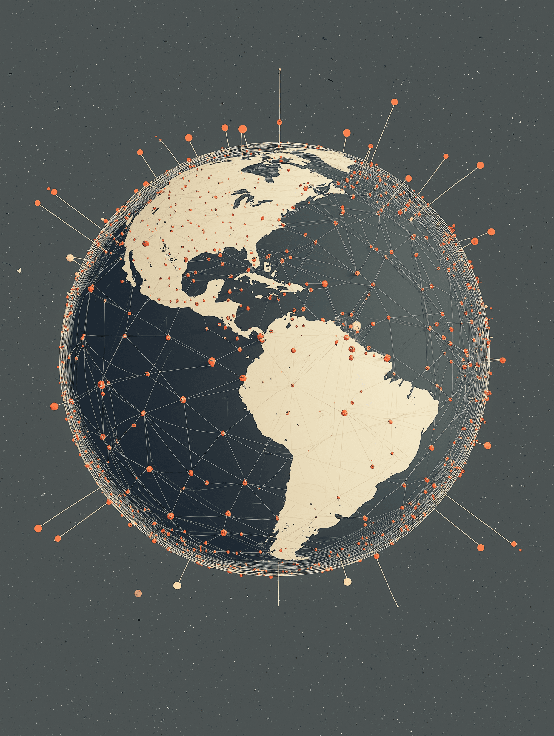 A globe with roads, railways, and shipping lanes spiraling outward like a spider’s web
