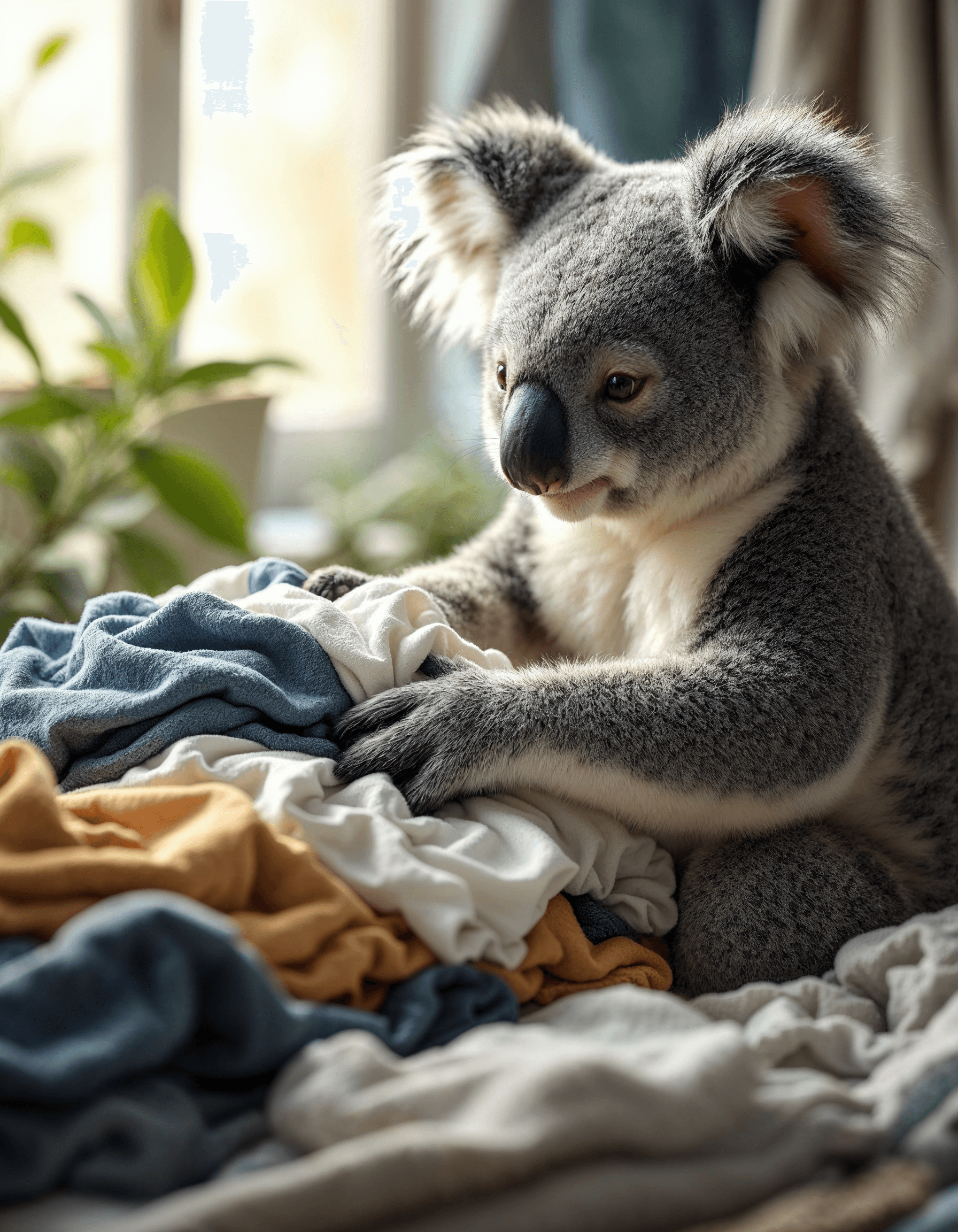 A koala meticulously folding laundry, carefully separating whites and colors