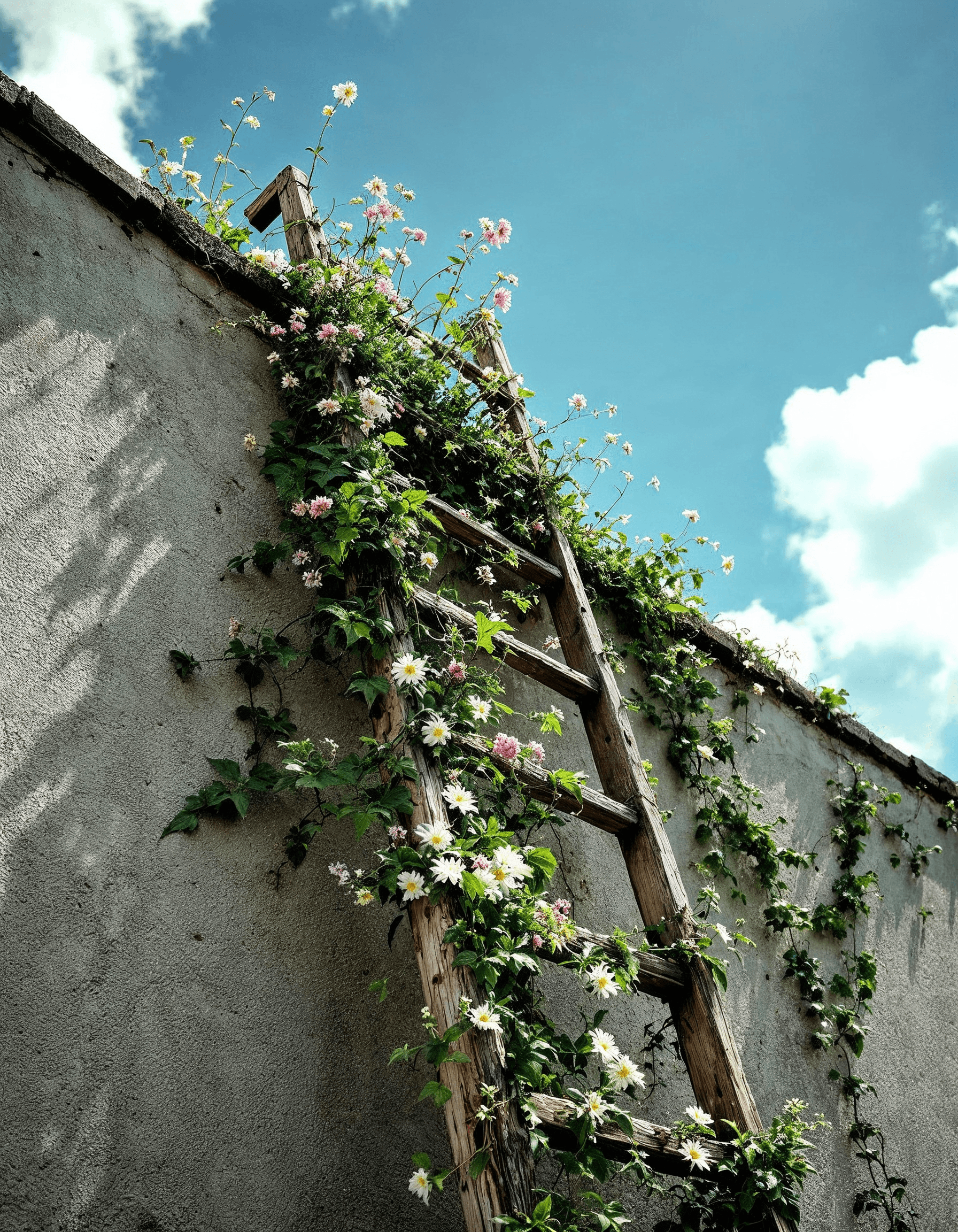 A ladder intertwined with vines and blooming flowers, showing how persistence and nature intertwine to create sustainable growth