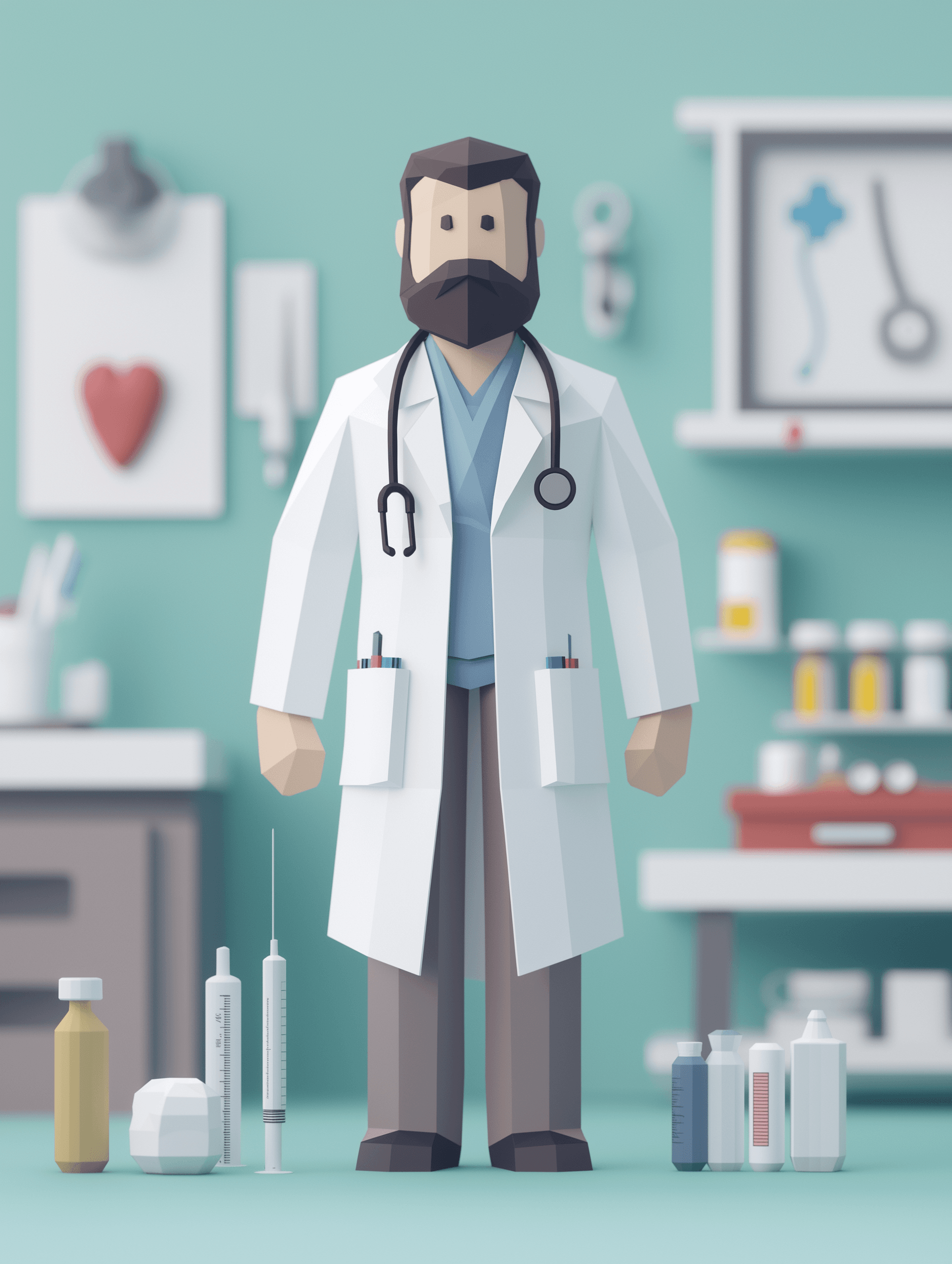 A low-poly doctor with angular medical equipment, such as a stethoscope and syringes, set against a minimalist hospital backdrop