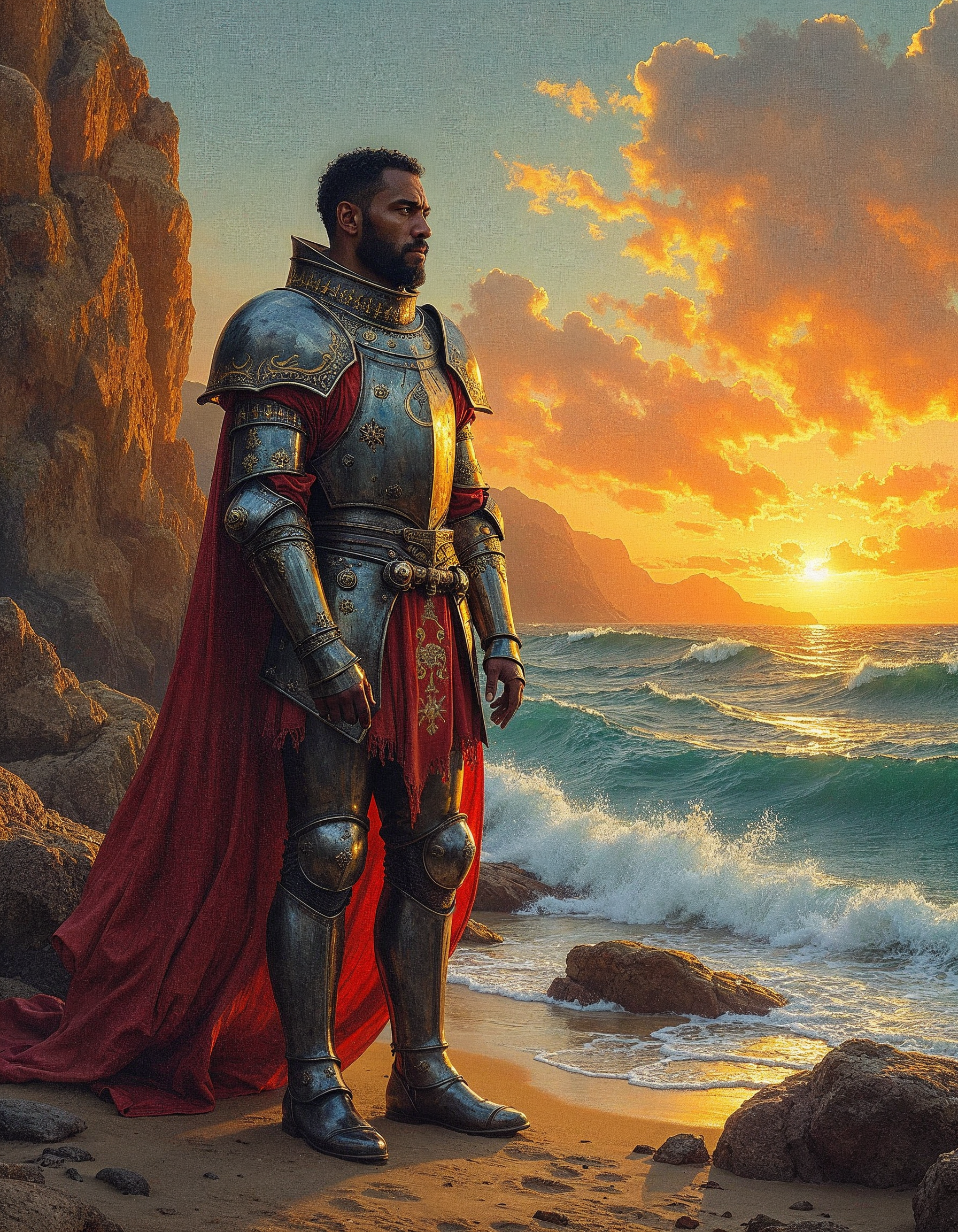 Discover a stunning medieval fresco featuring a solitary armored knight adorned with mystical glowing runes, set against an enchanting cosmic landscape.