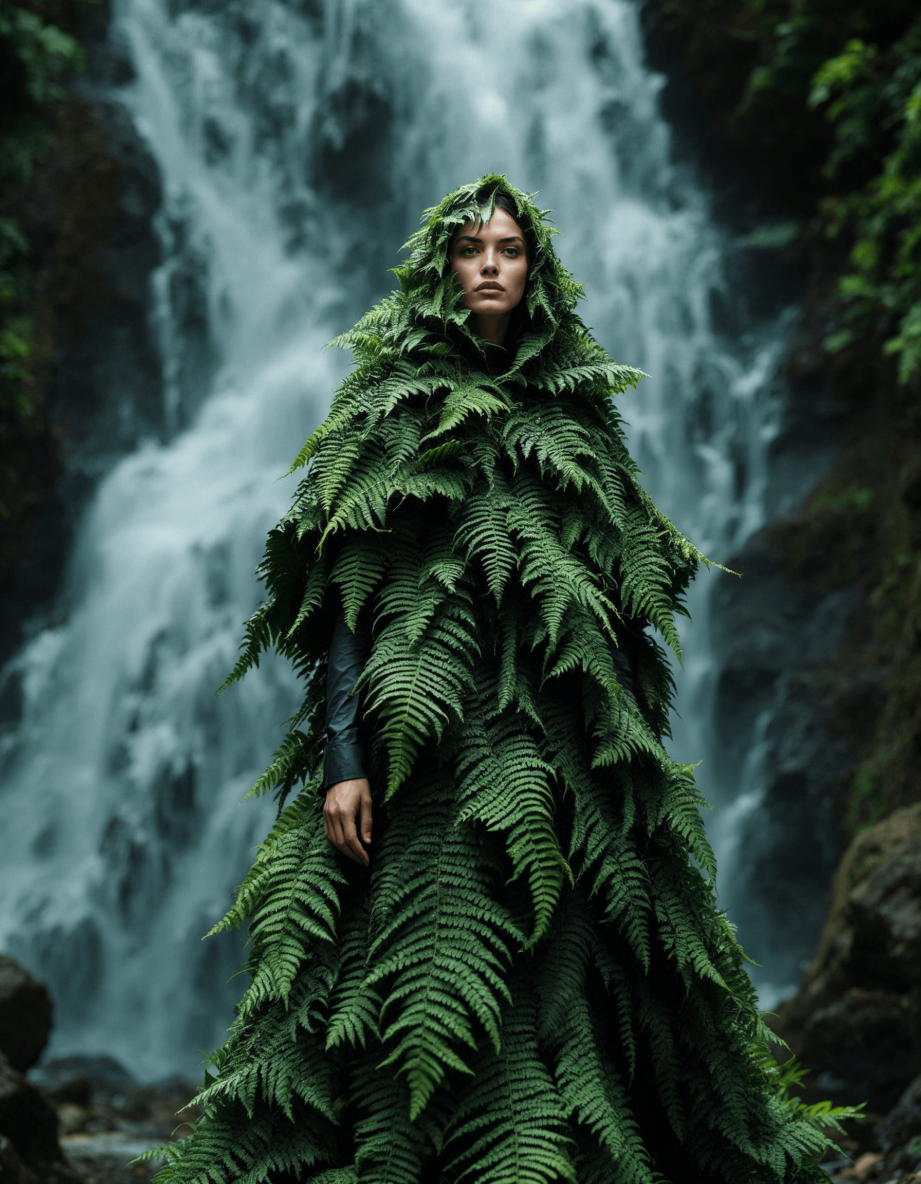 A model draped in a cape made of lush ferns, creating a dramatic silhouette against a waterfall