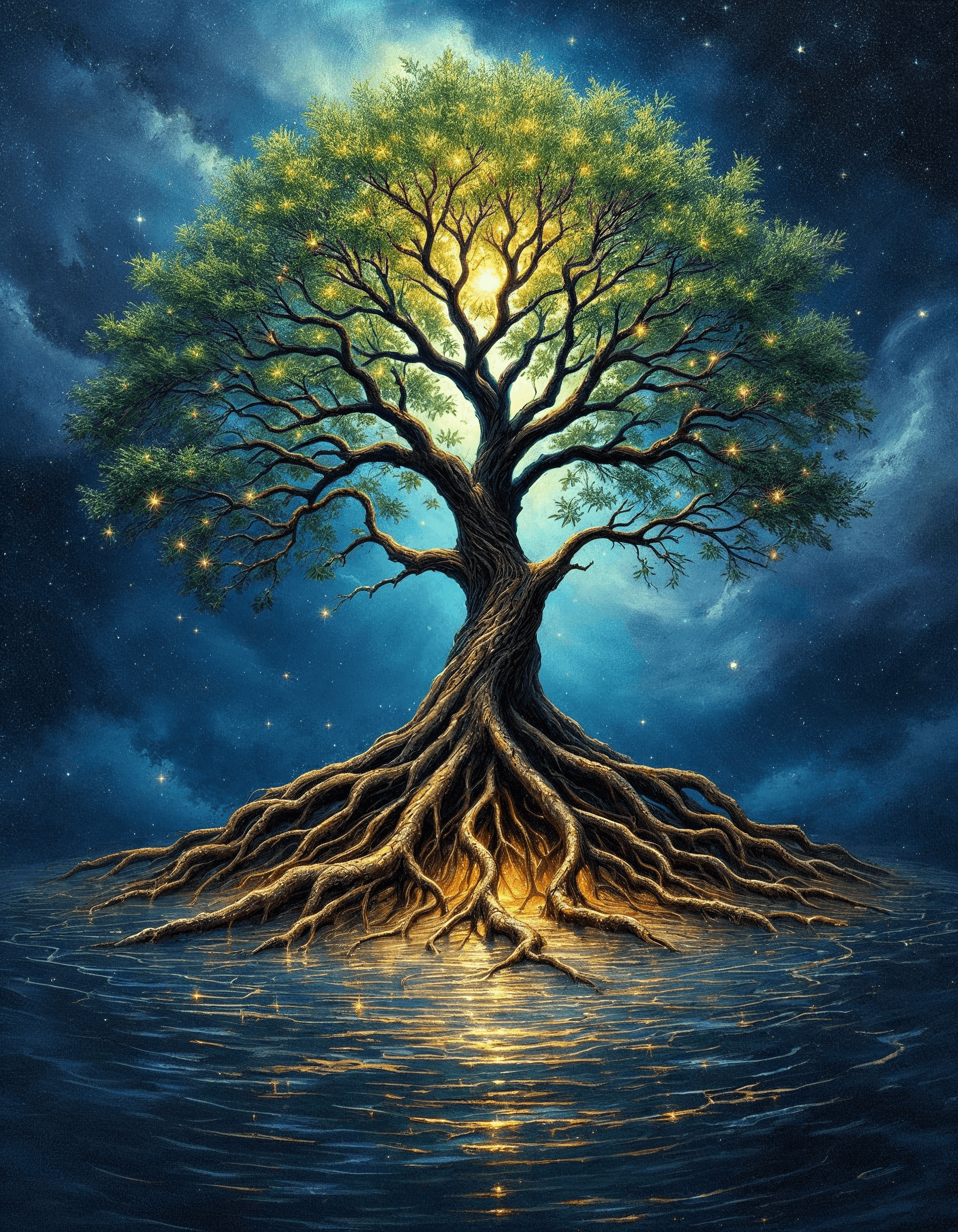 A mystical tree of life, its branches reaching towards the heavens and its roots deep within the earth