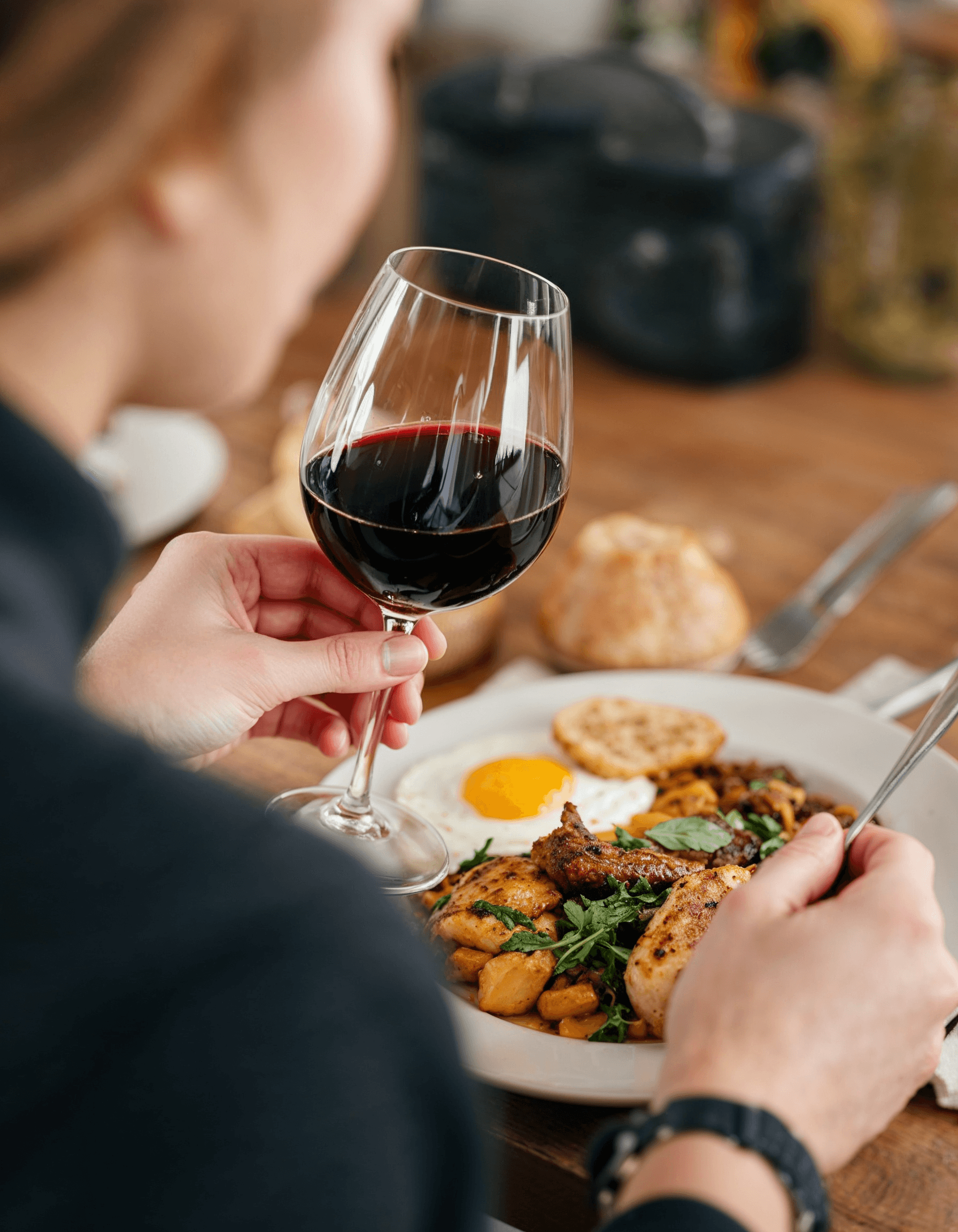 A person enjoying a glass of wine with a delicious meal, highlighting the pairing of food and wine