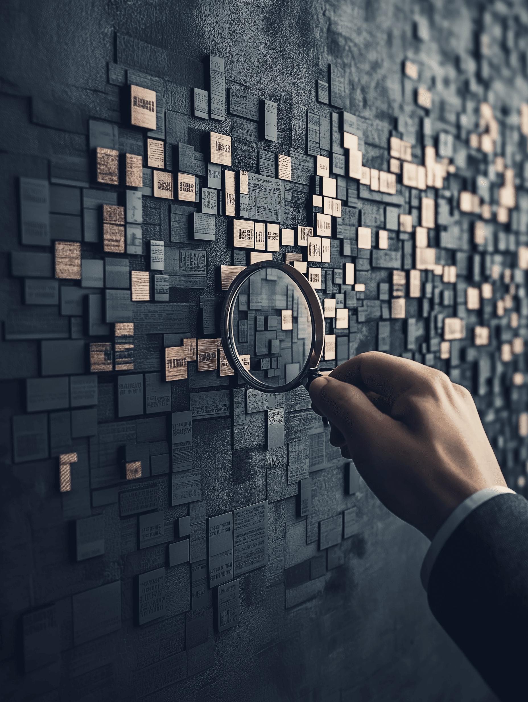 A person holding a magnifying glass, examining a wall of QR codes, ads, and barcodes, symbolizing modern marketing strategies