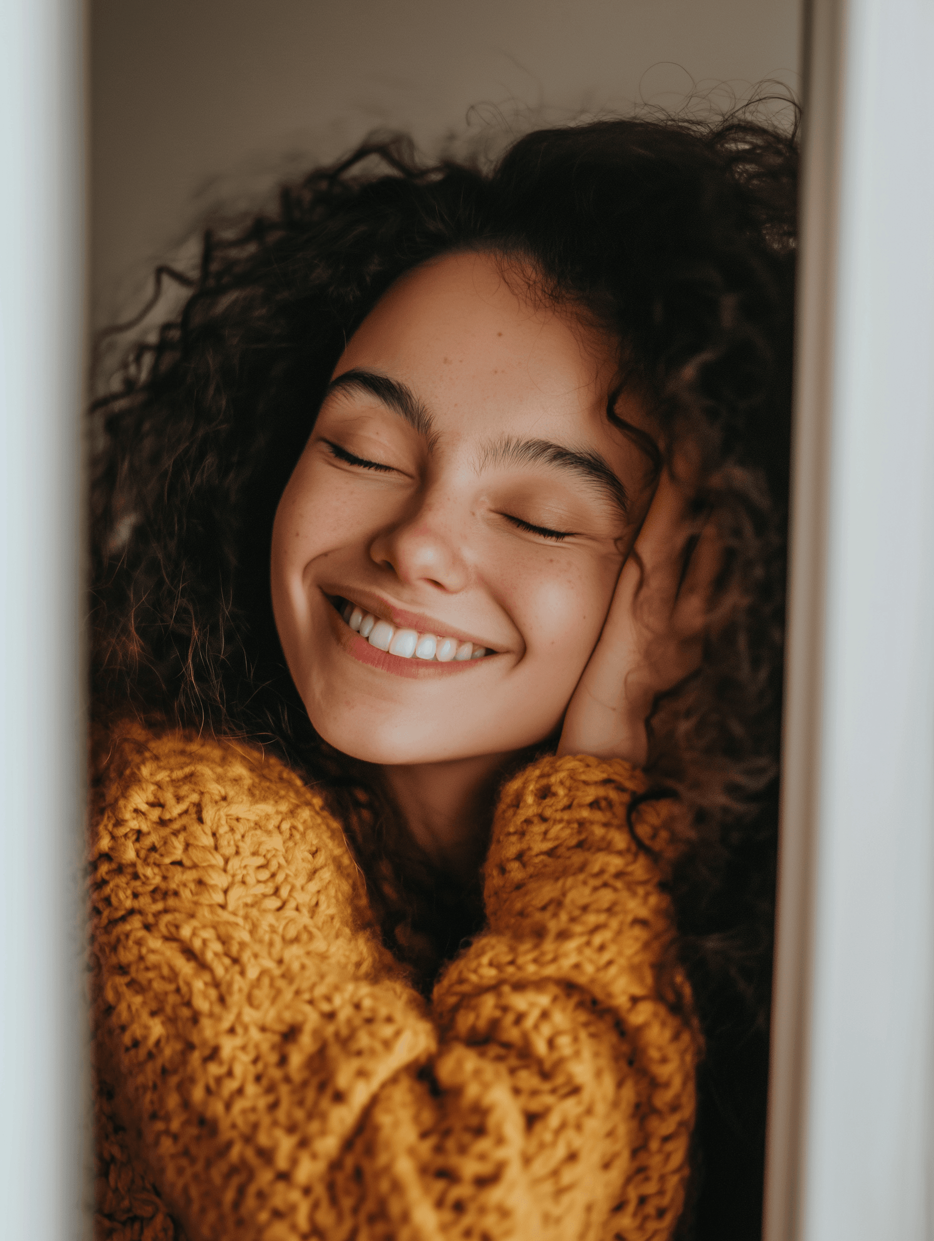 A person hugging themselves or smiling while looking in the mirror, emphasizing self-acceptance and emotional well-being