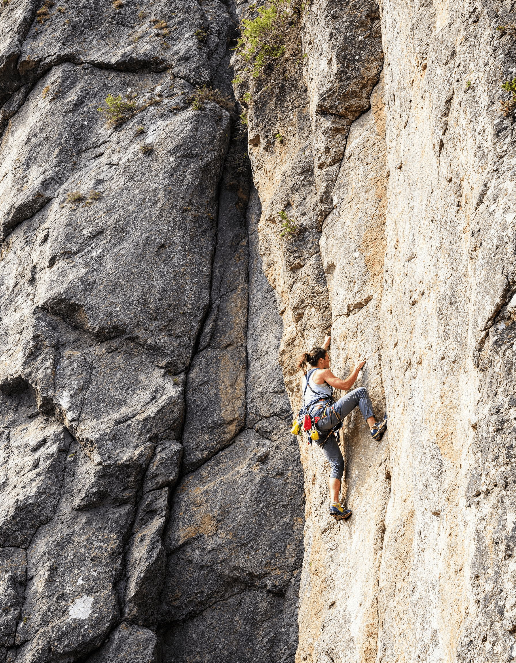 A person rock climbing on a challenging cliff face, demonstrating agility and focus