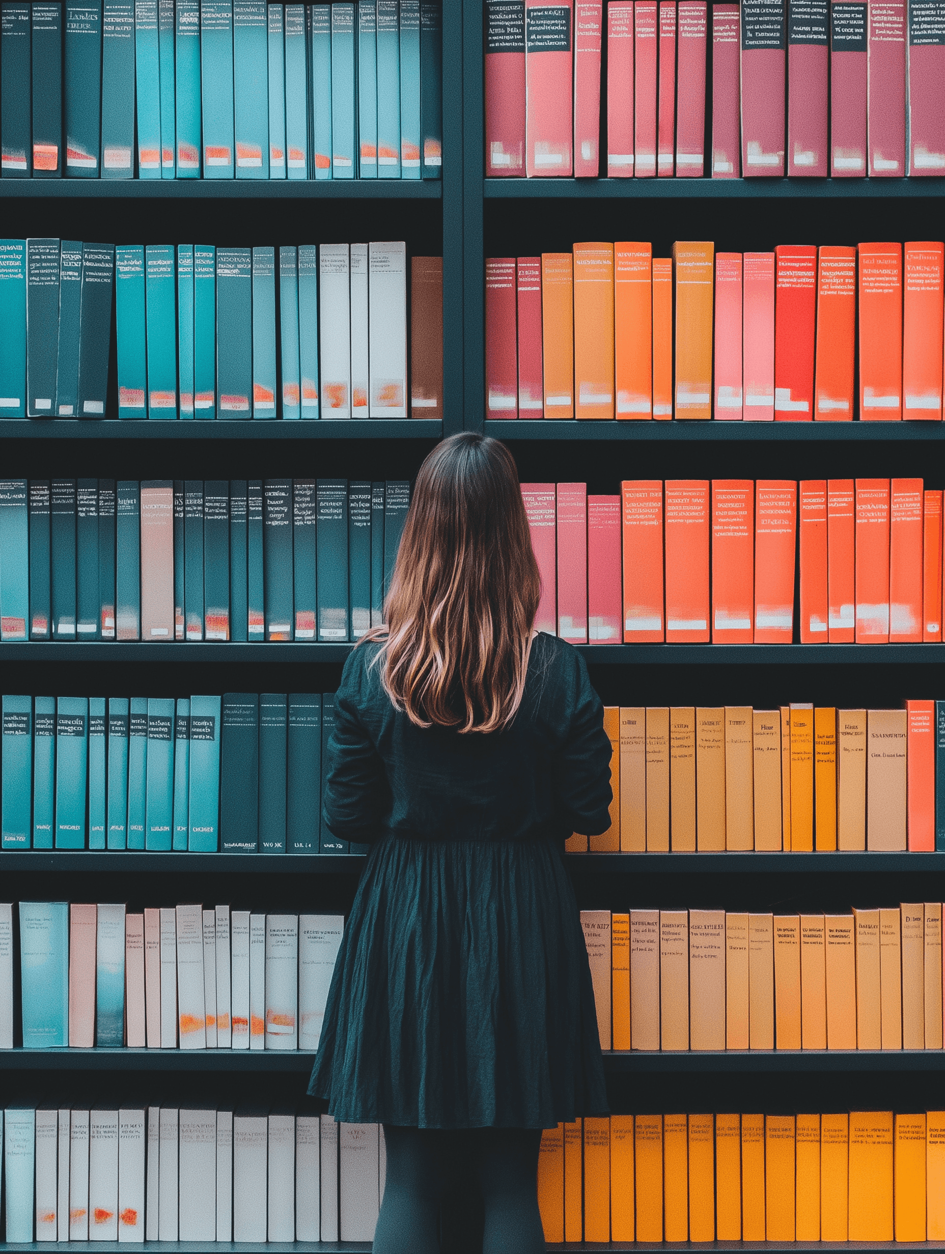 A person standing before a bookshelf filled with textbooks arranged in a rainbow of colors, symbolizing the pursuit of knowledge