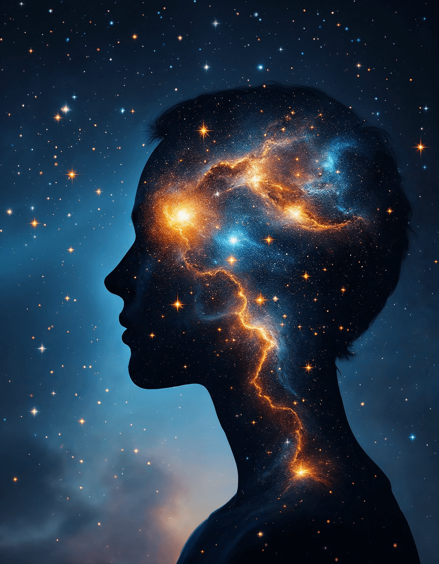 A person’s silhouette filled with stars and galaxies, symbolizing the vastness of human consciousness and potential