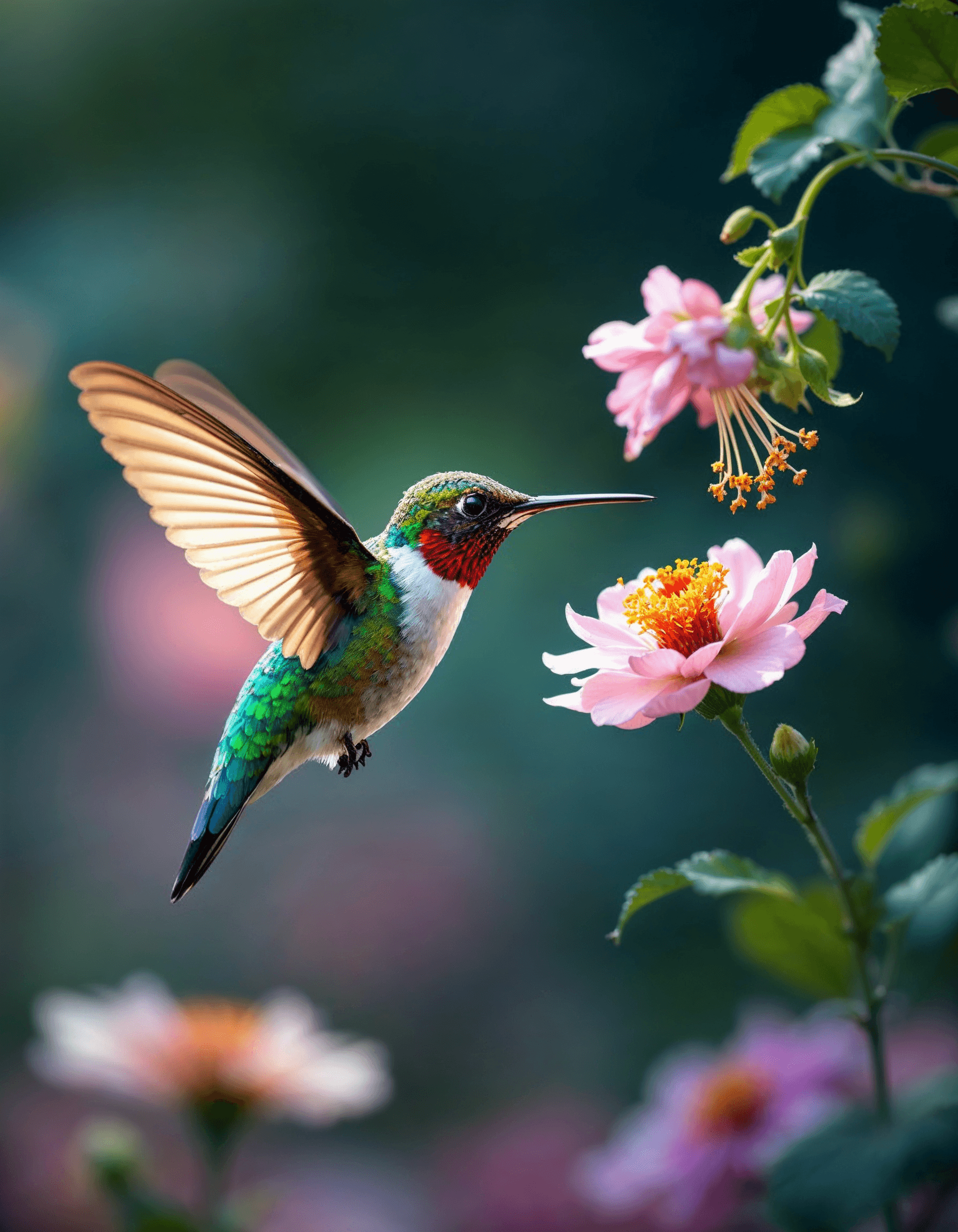 A photorealistic image of a hummingbird sipping nectar from a flower, showcasing the intricate adaptations of different species
