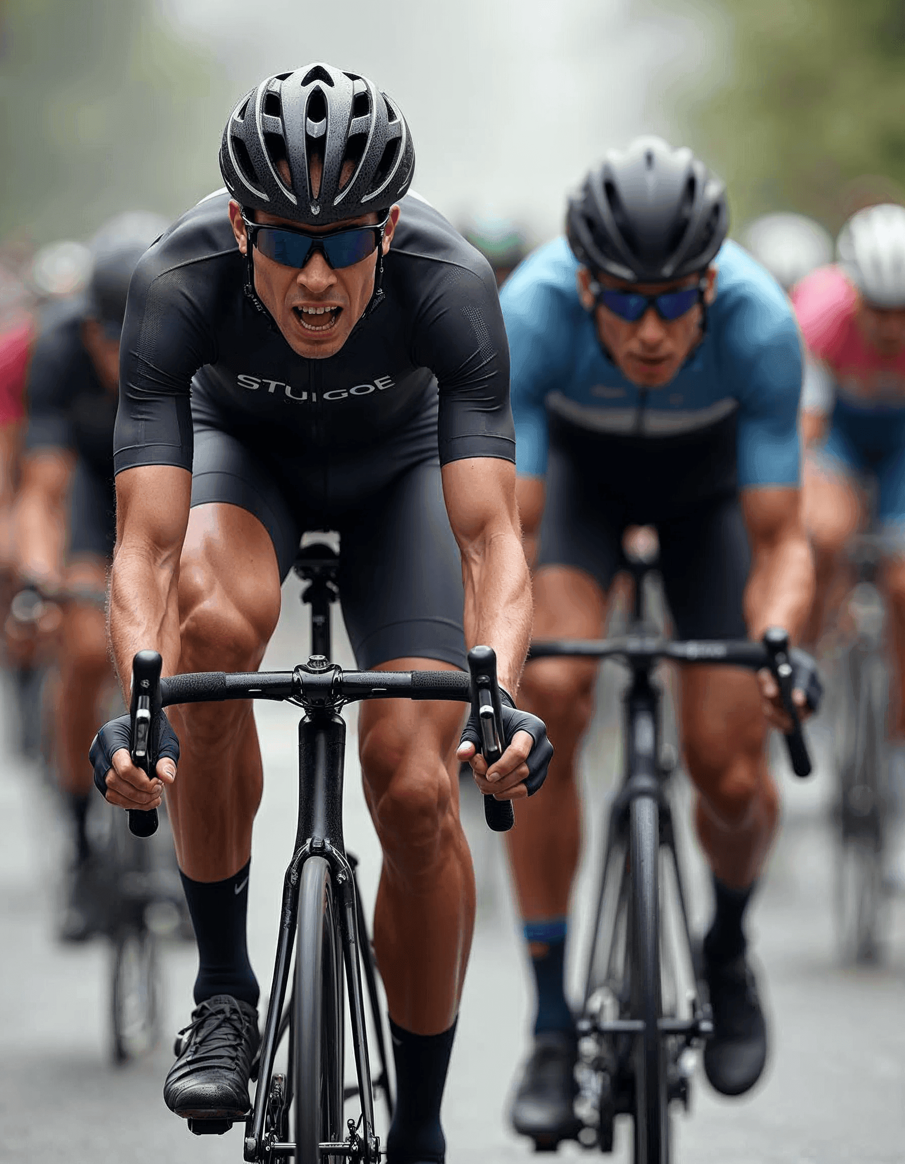 Two cyclists battle in an intense sprint finish, their determined expressions captured in stunning photorealistic detail as they race neck-and-neck.