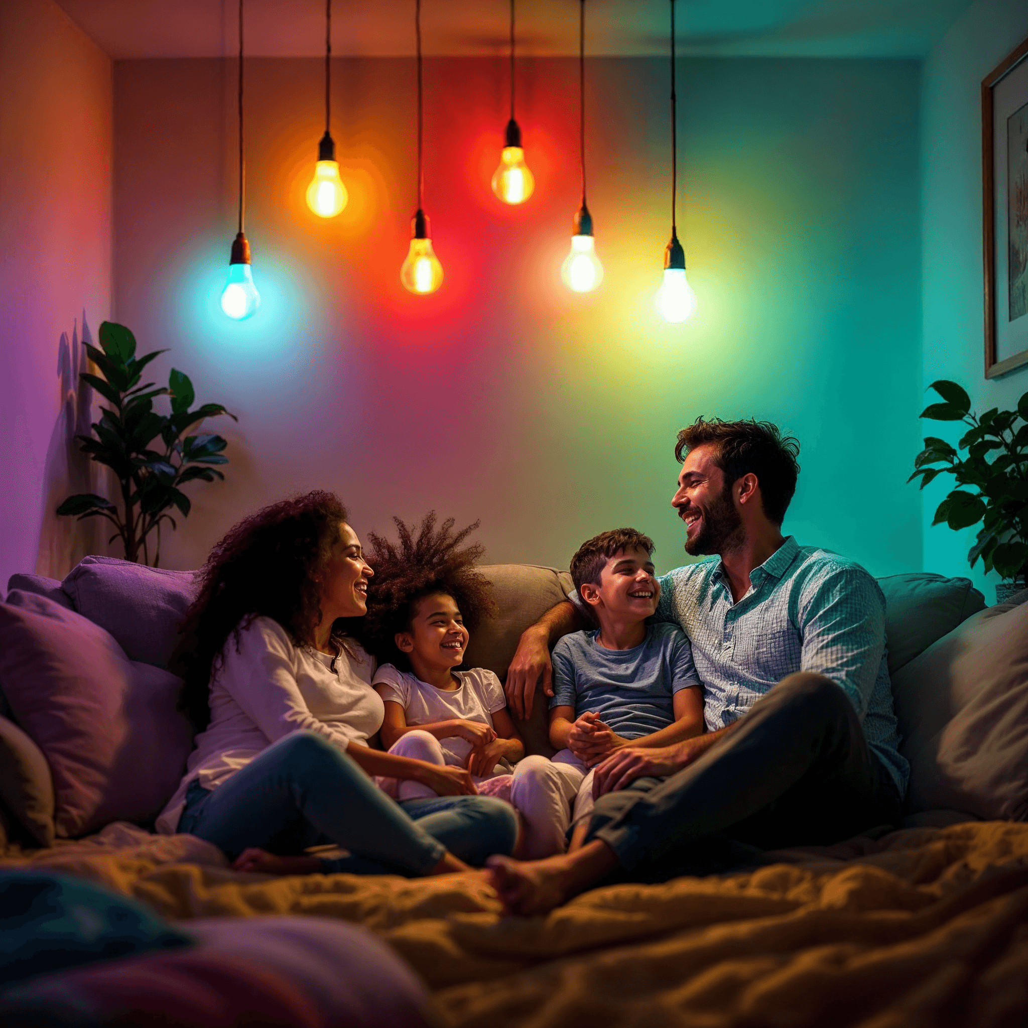A room illuminated by light bulbs that change color and intensity based on the occupants’ moods
