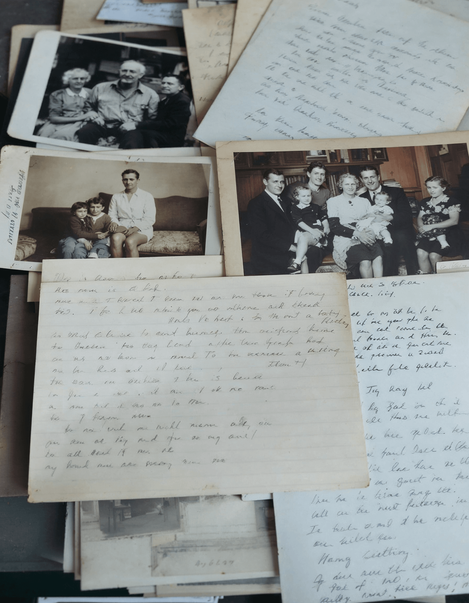 A stack of old photographs and letters, revealing glimpses into the lives of people from the past