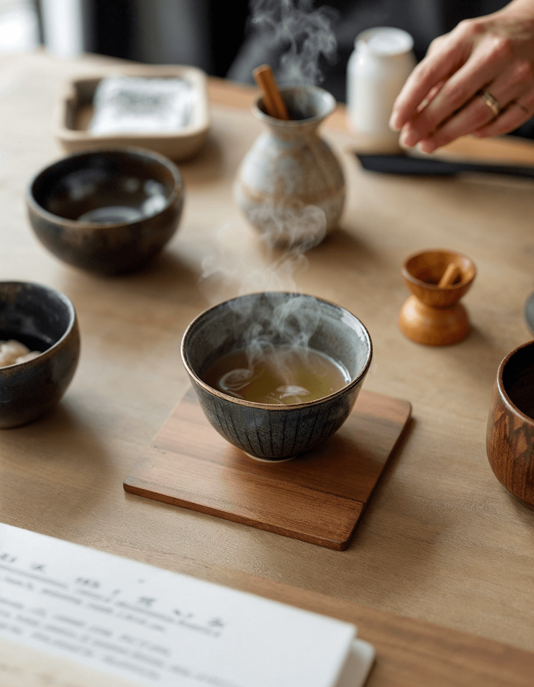 A traditional Japanese tea ceremony, with handcrafted tea bowls and utensils