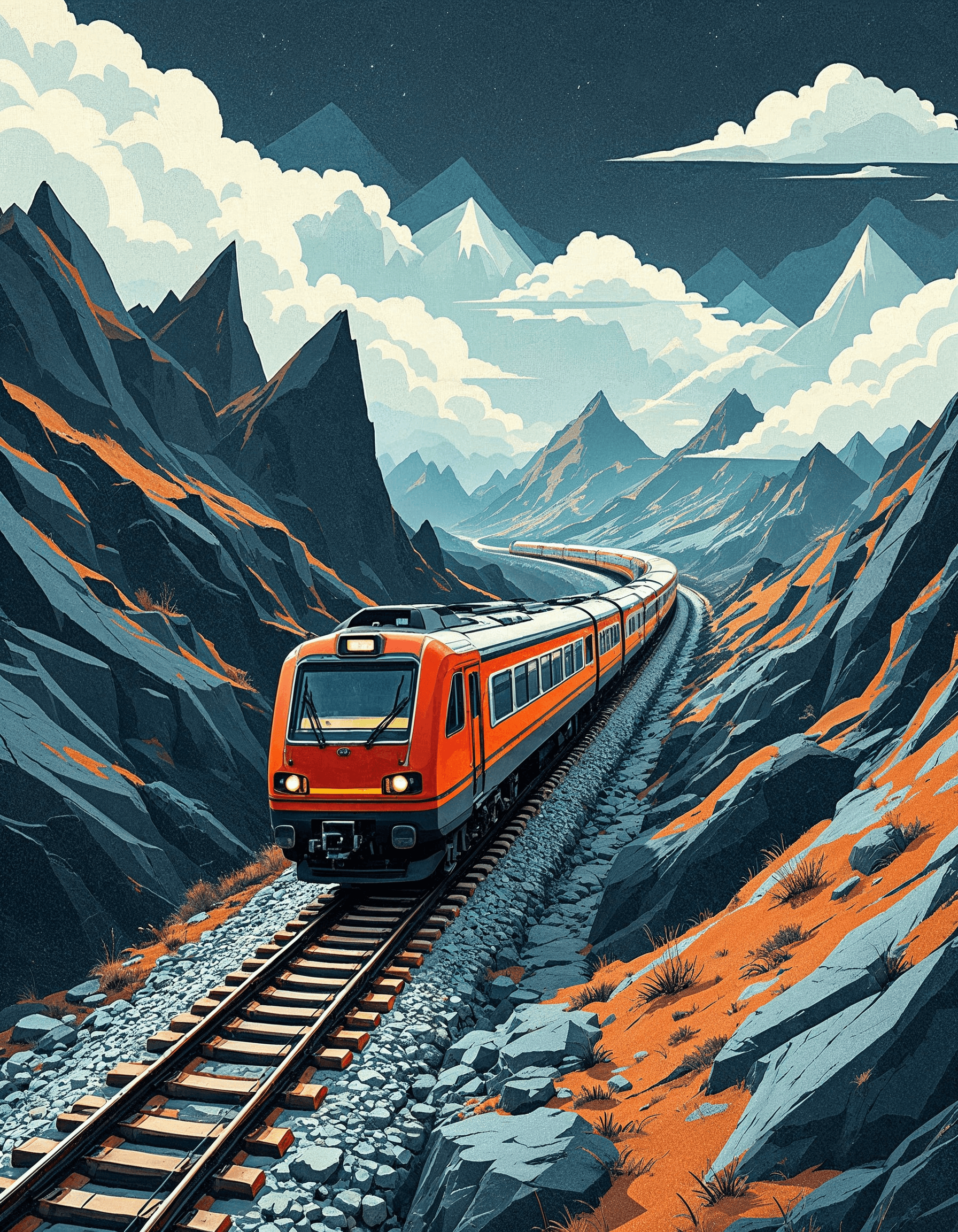 A train speeding through an abstract landscape of intersecting tracks, angular mountains, and sharp-edged clouds