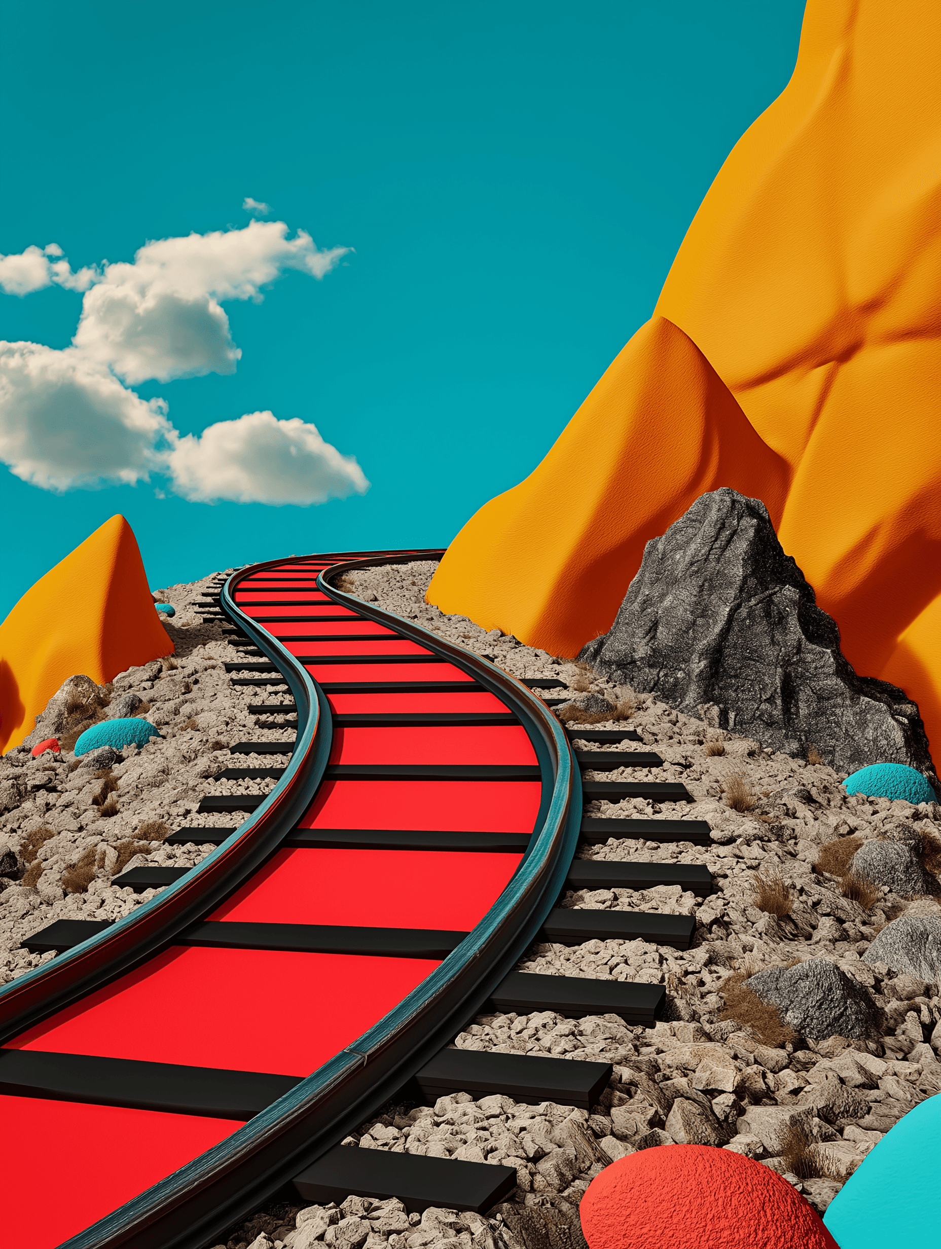 A train track turning into a rolling red carpet, highlighting the luxury and allure of travel experiences