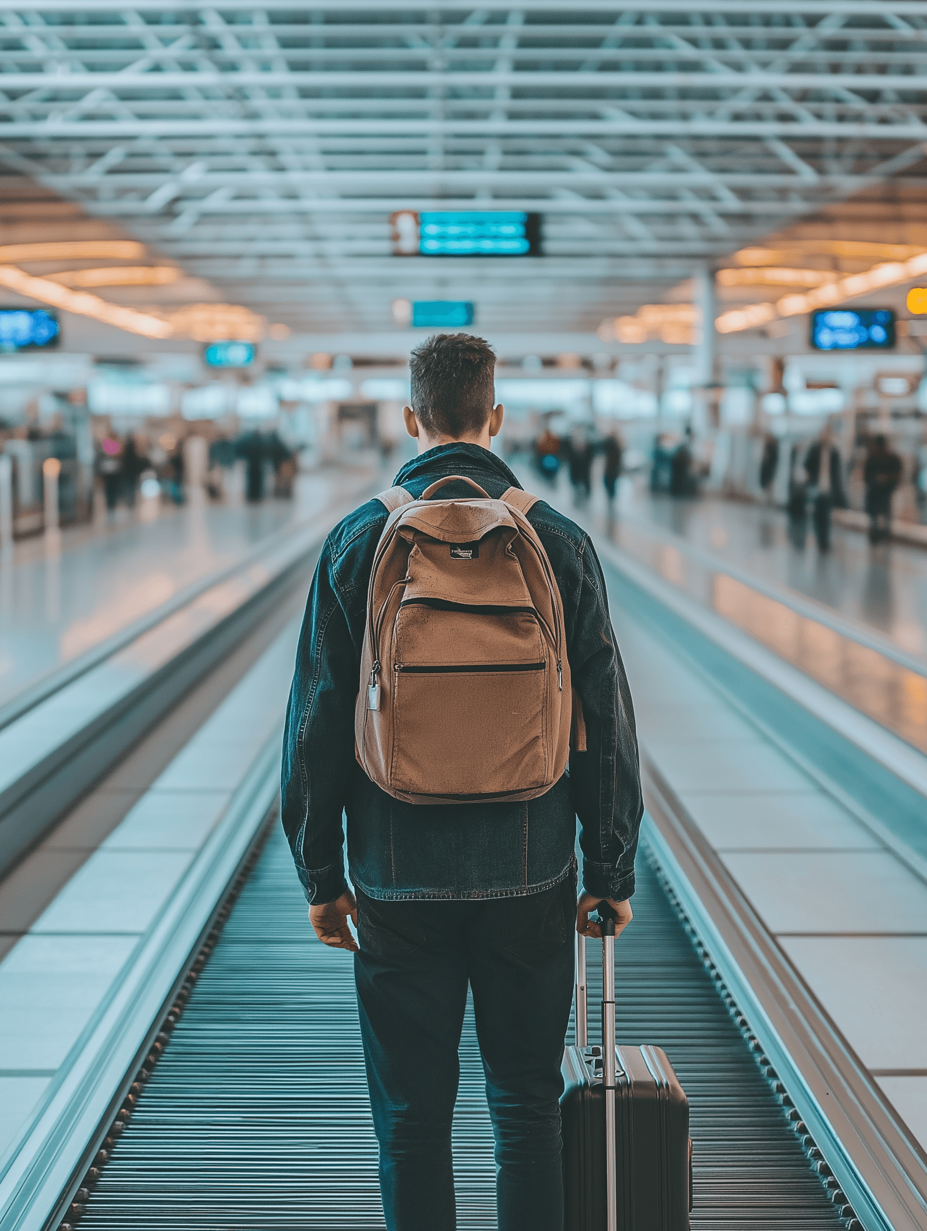A traveler standing on a conveyor belt with a luggage tag attached to them, representing streamlined and automated transport experiences