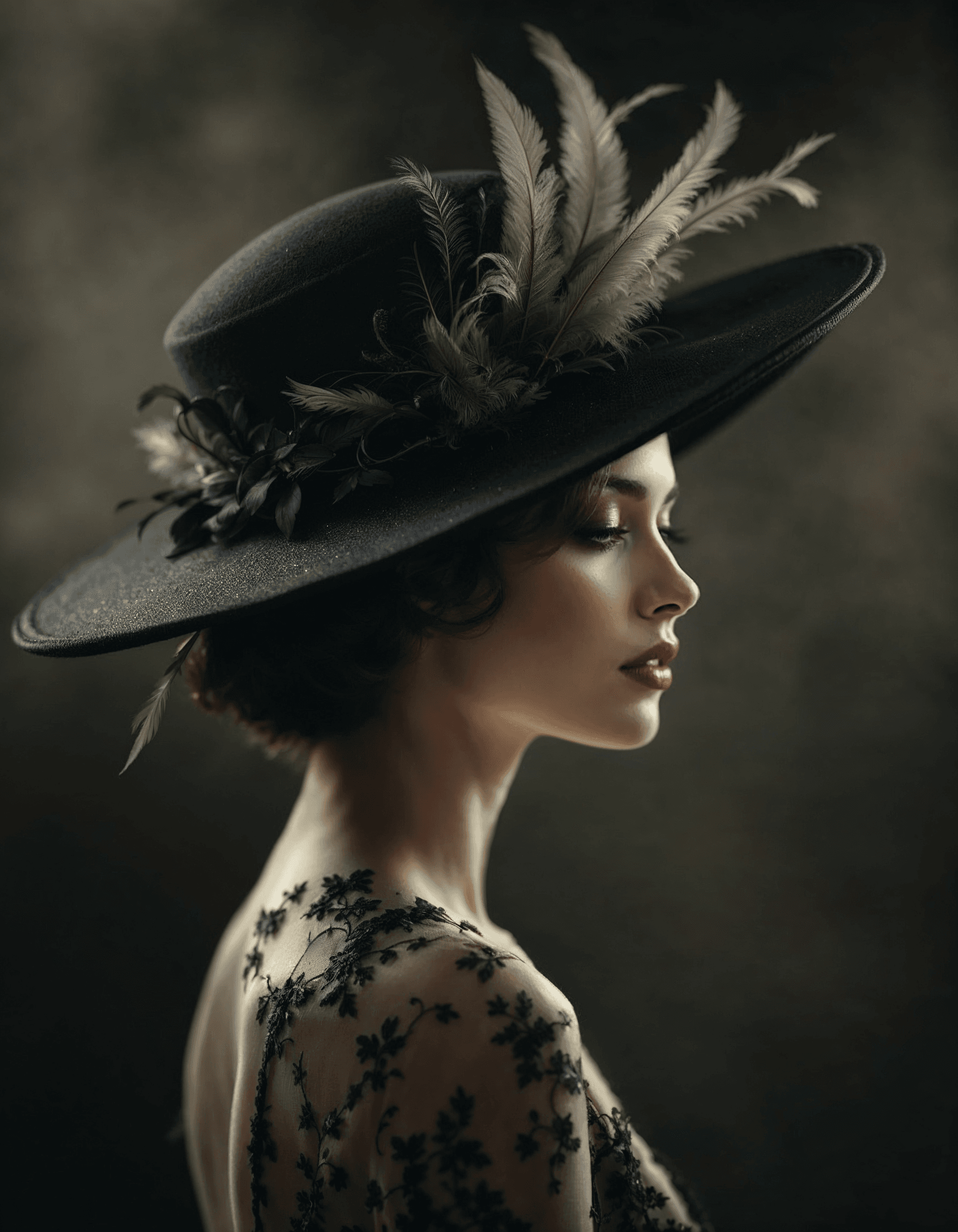 A vintage hat with a wide brim and delicate feathers, adding a touch of elegance and mystery