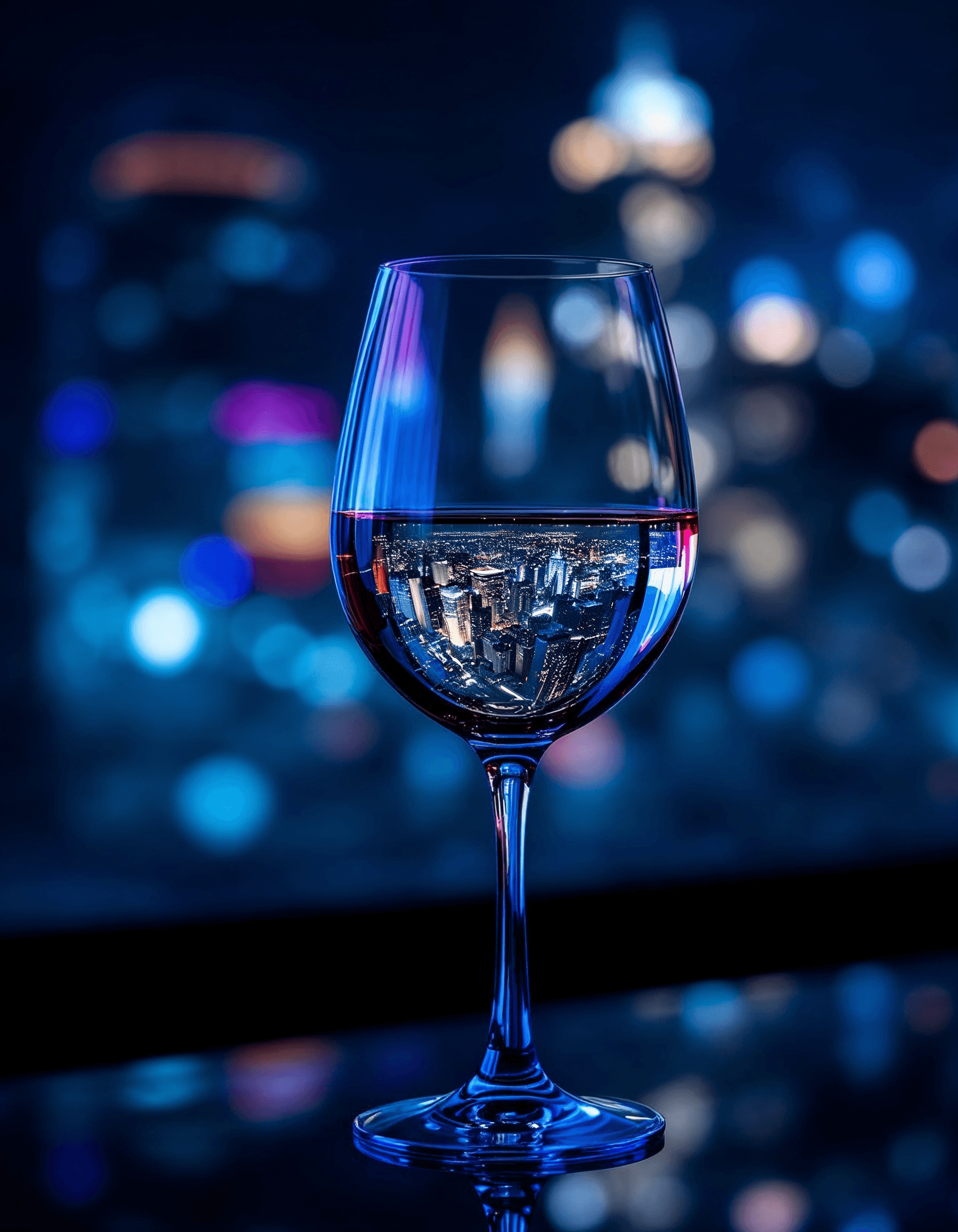 A wine glass reflecting the city lights, symbolizing the sophisticated and celebratory aspects of wine