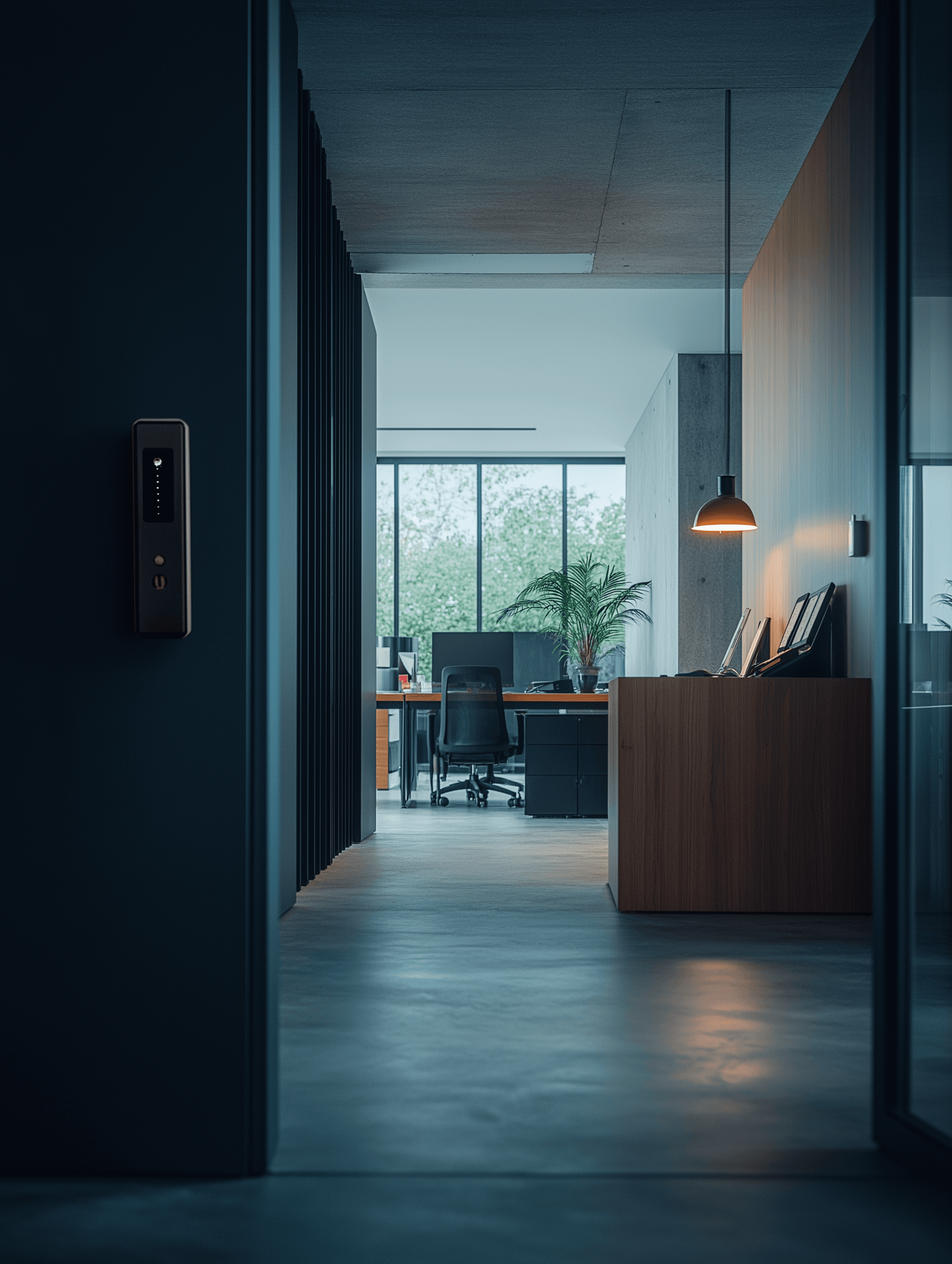 An office door with a digital fingerprint scanner unlocking not just a room but an entire workspace layout